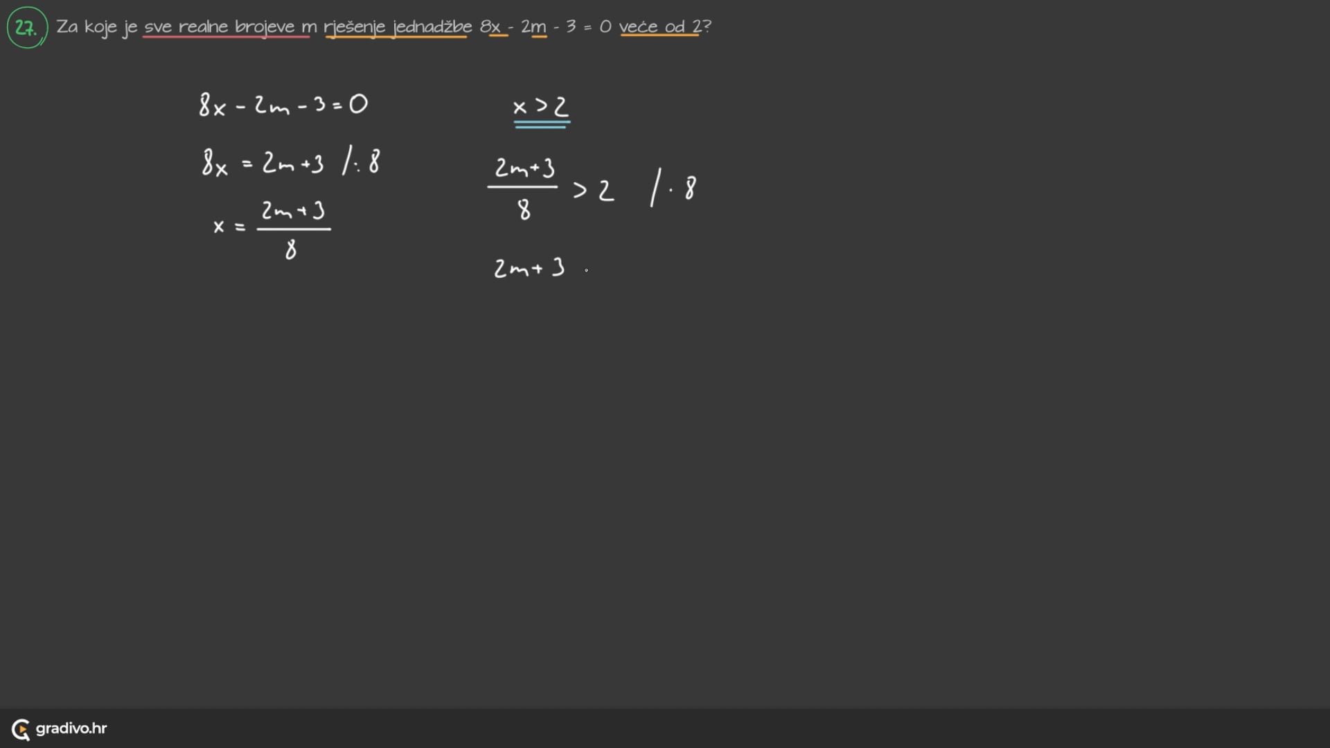 Za koje je sve realne brojeve \(m\) rješenje jednadžbe \(8 x-2 m-3=0\) veće od 2?