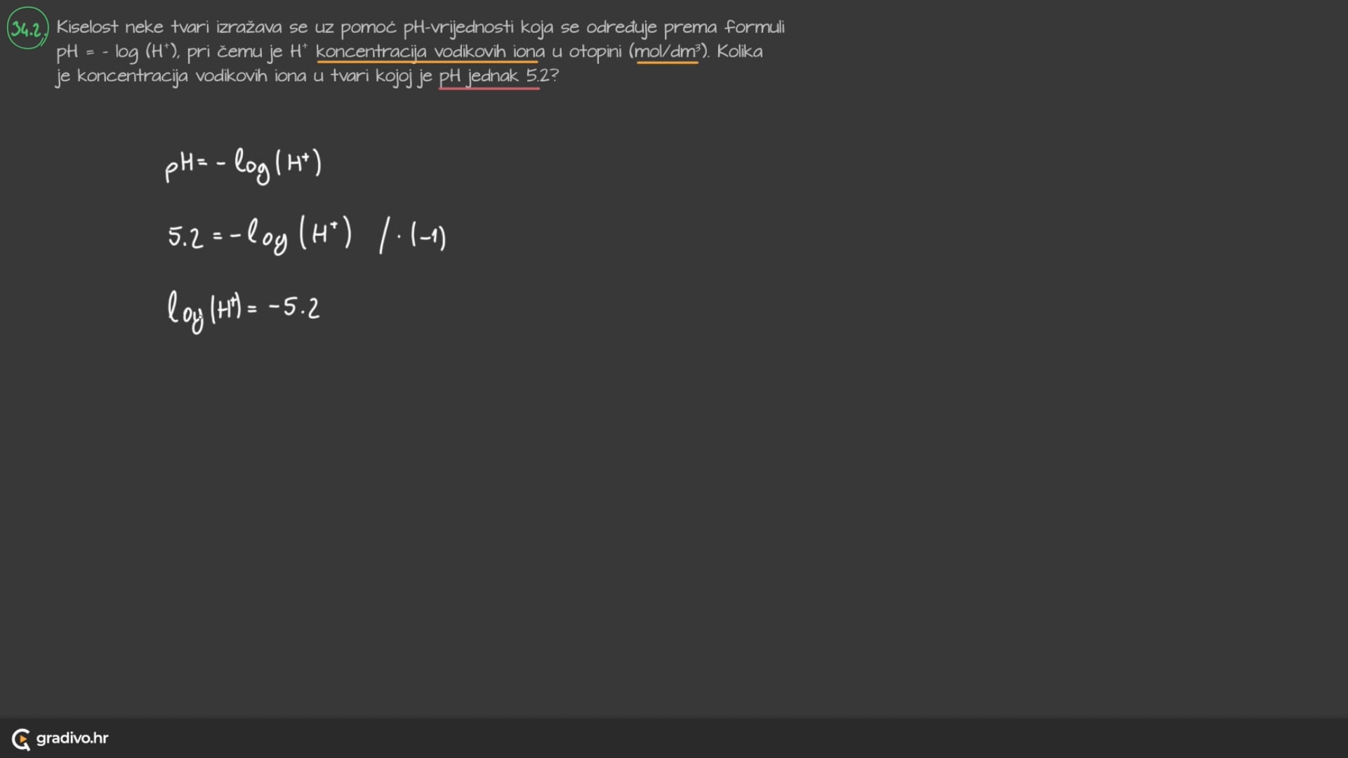 Kiselost neke tvari izražava se uz pomoć pH-vrijednosti koja se određuje prema formuli $\mathrm{pH}=-\log \left(\mathrm{H}^{+}\right)$, pri čemu je $\mathrm{H}^{+}$koncentracija vodikovih iona u otopini ( $\mathrm{mol} / \mathrm{dm}^3$ ). Kolika je koncentracija vodikovih iona u tvari kojoj je pH jednak 5.2?