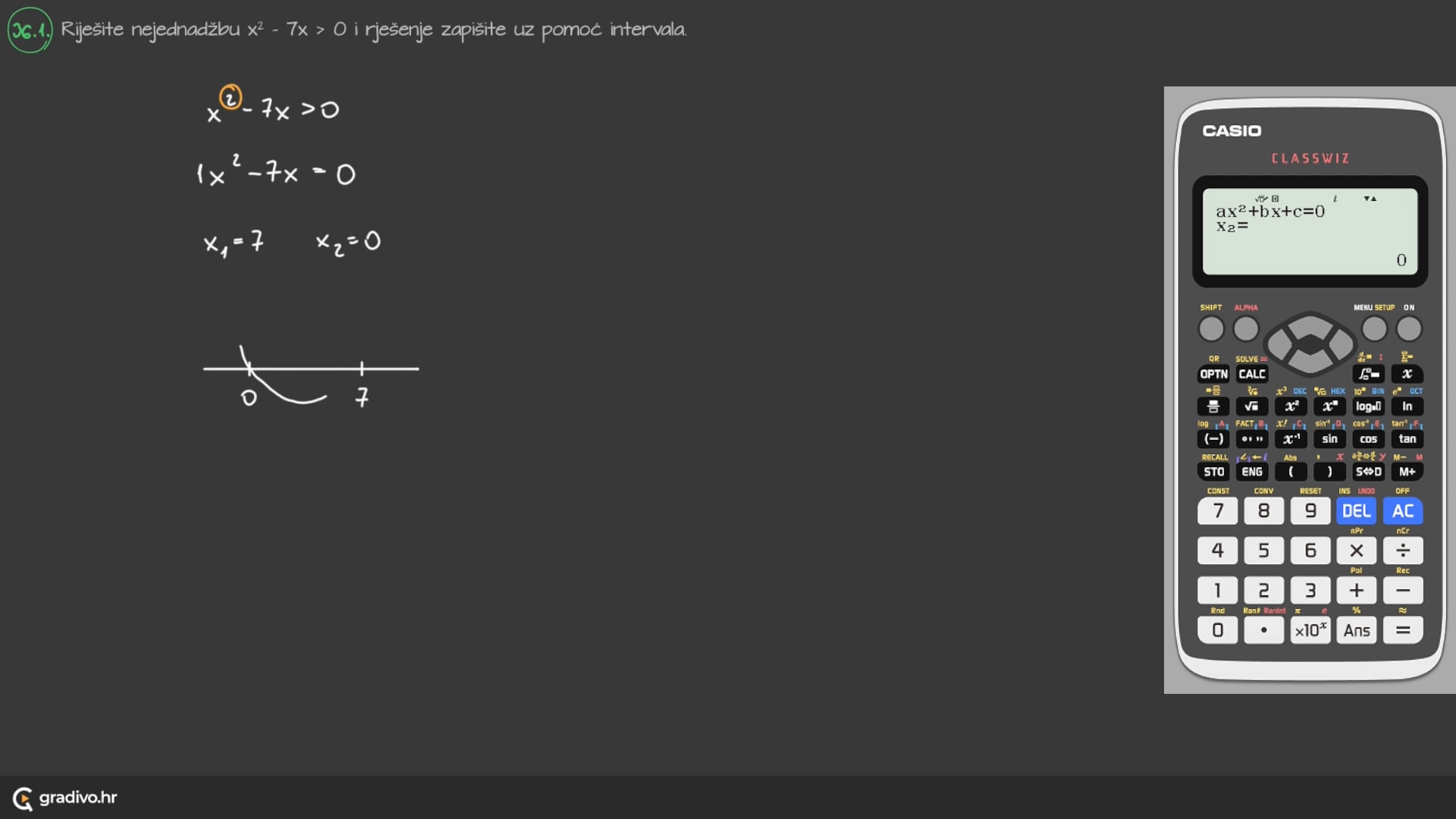 Riješite nejednadžbu \(x^{2}-7 x>0\) i rješenje zapišite uz pomoć intervala.