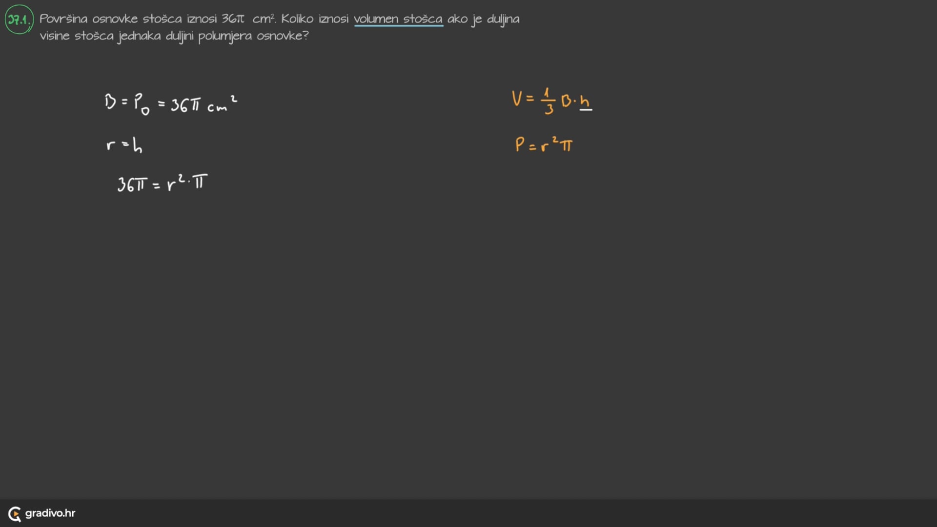 Površina osnovke stošca iznosi \(36 \pi \mathrm{~cm}^{2}\). Koliko iznosi volumen stošca ako je duljina visine stošca jednaka duljini polumjera osnovke?
