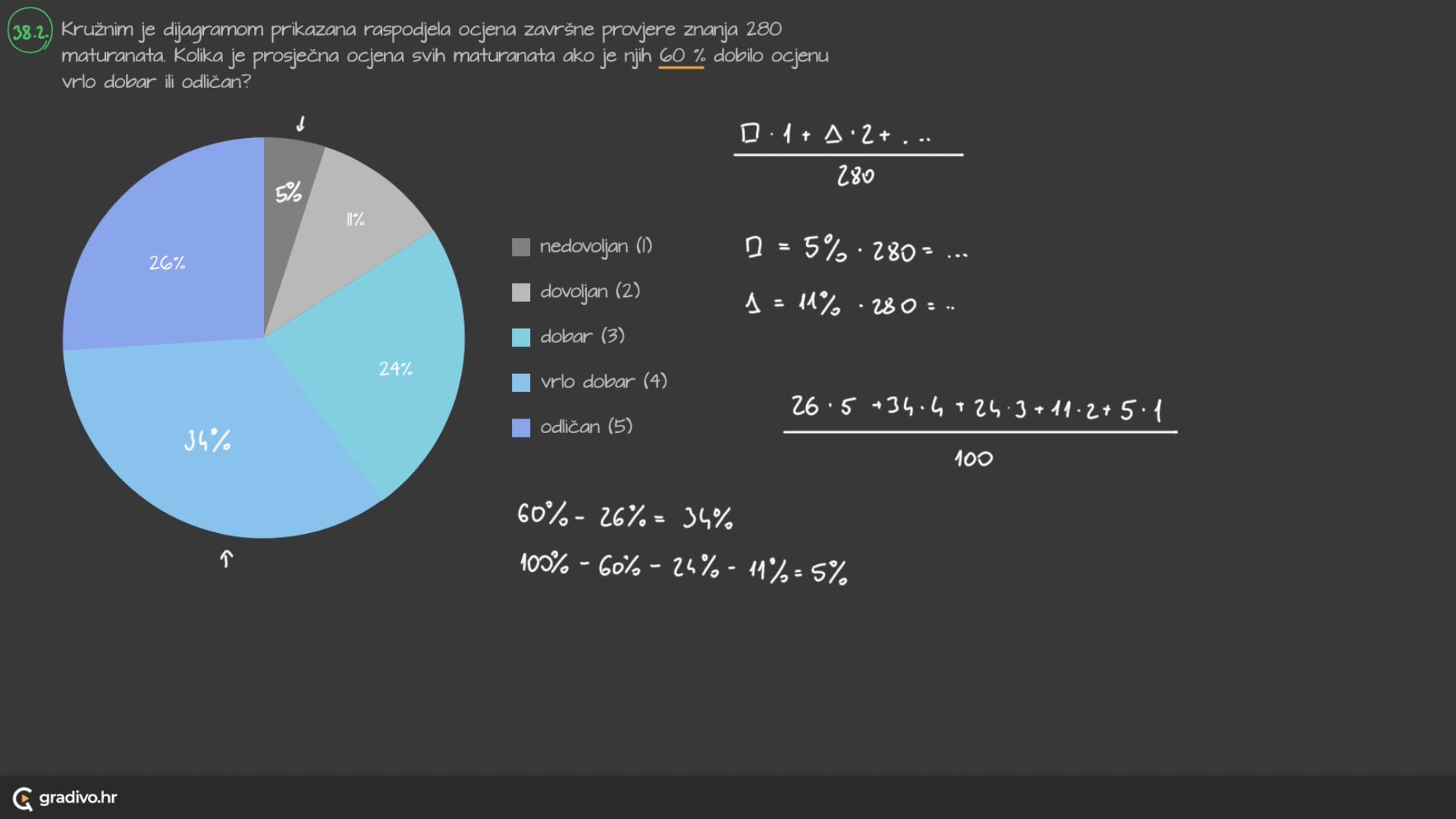 Kružnim je dijagramom prikazana raspodjela ocjena završne provjere znanja 280 maturanata. Kolika je prosječna ocjena svih maturanata ako je njih 60 % dobilo ocjenu vrlo dobar ili odličan?