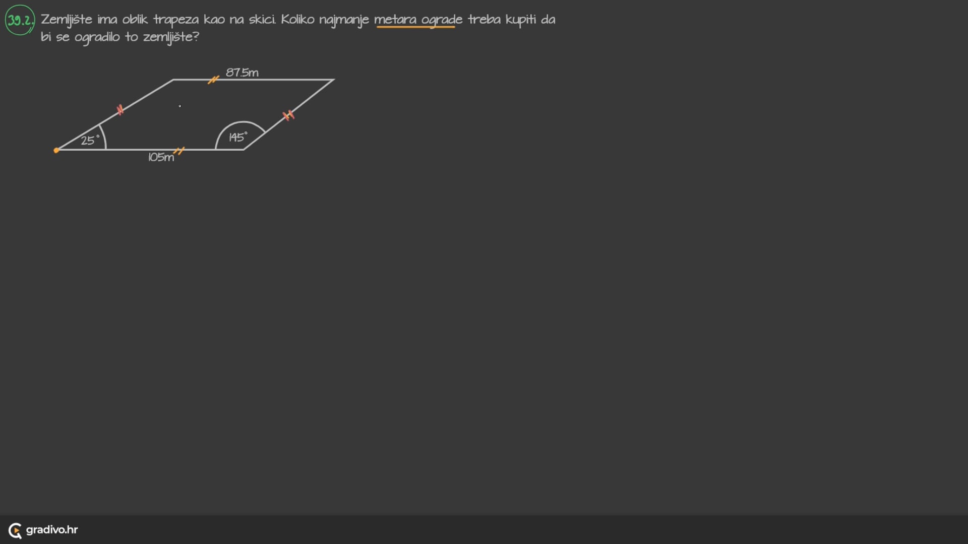 Zemljište ima oblik trapeza kao na skici. Koliko najmanje metara ograde treba kupiti da bi se ogradilo to zemljište?