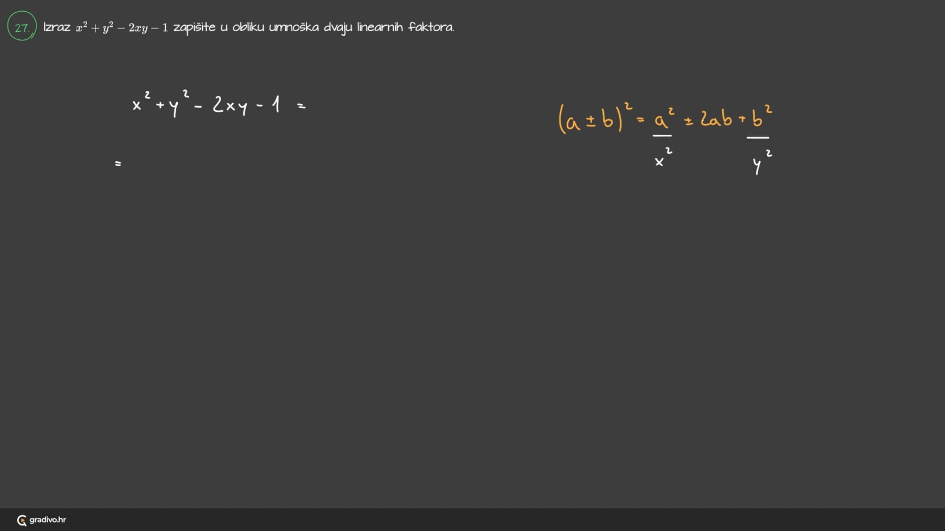 Izraz $x^{2}+y^{2}-2 x y-1$ zapišite u obliku umnoška dvaju linearnih faktora.