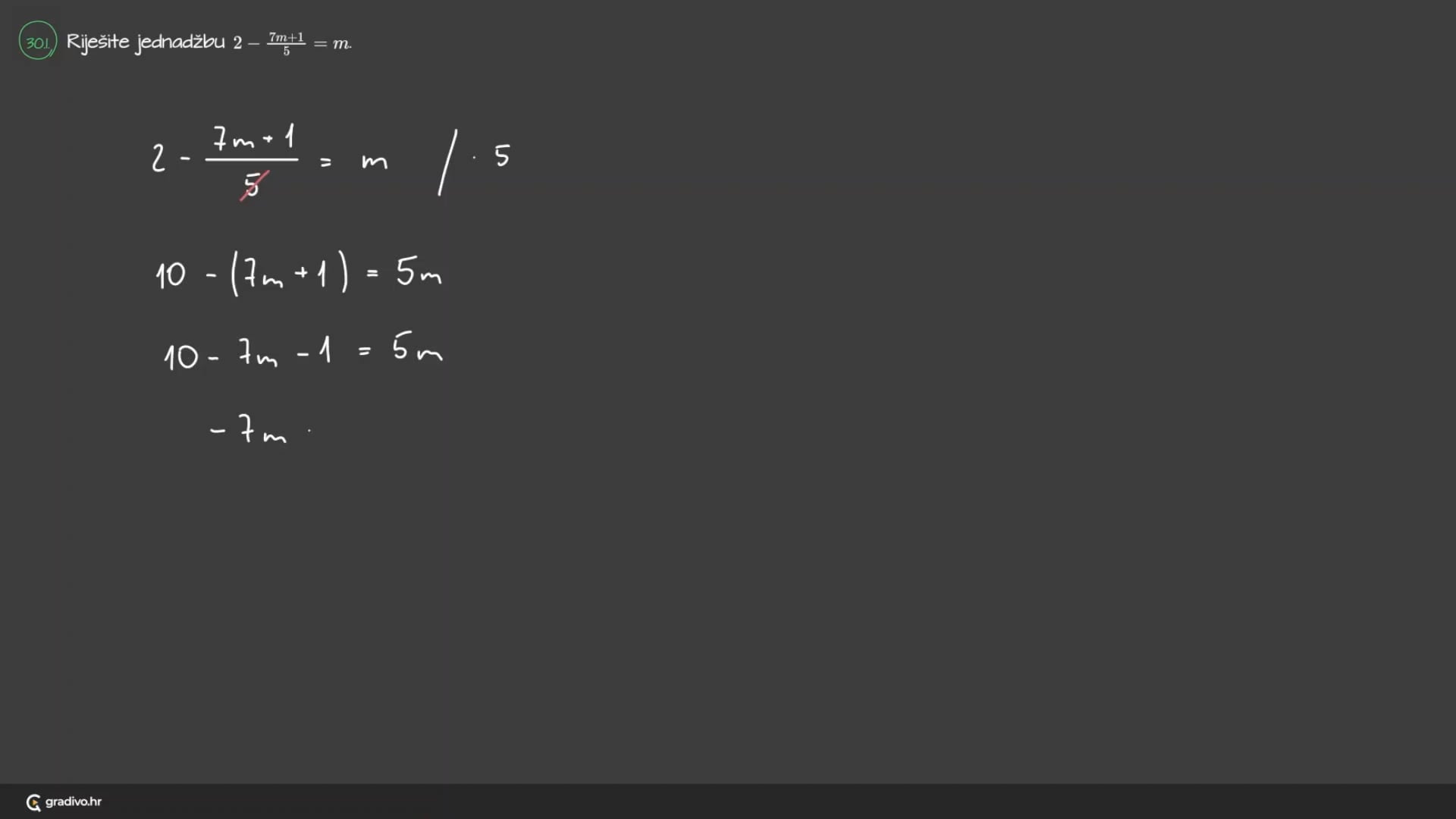 Riješite jednadžbu $2-\frac{7 m+1}{5}=m$.