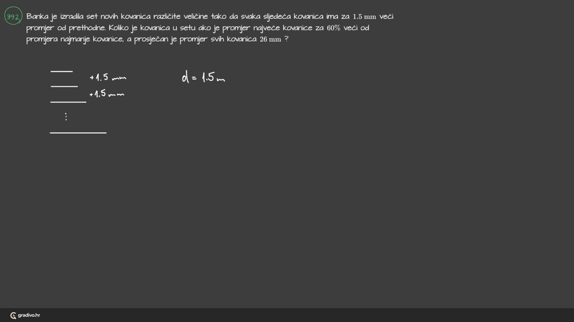 Banka je izradila set novih kovanica različite veličine tako da svaka sljedeća kovanica ima za 1.5 mm veći promjer od prethodne. Koliko je kovanica u setu ako je promjer najveće kovanice za 60 % veći od promjera najmanje kovanice, a prosječan je promjer svih kovanica 26 mm ?