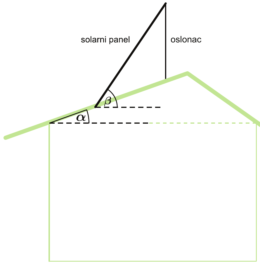 Na skici je prikazan krov sa solarnim panelom. Kut između krova i horizontale mjere je $\alpha=30^{\circ}$, kut između solarnoga panela duljine 240 cm i horizontale mjere je $\beta=58^{\circ}$, a oslonac solarnoga panela okomit je na horizontalu. Koliko iznosi duljina oslonca?
