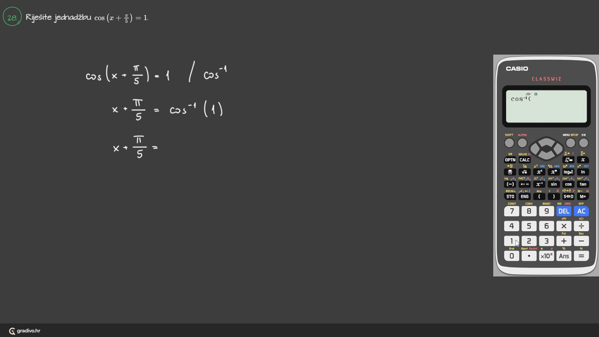 Riješite jednadžbu $\cos \left(x+\frac{\pi}{5}\right)=1$.