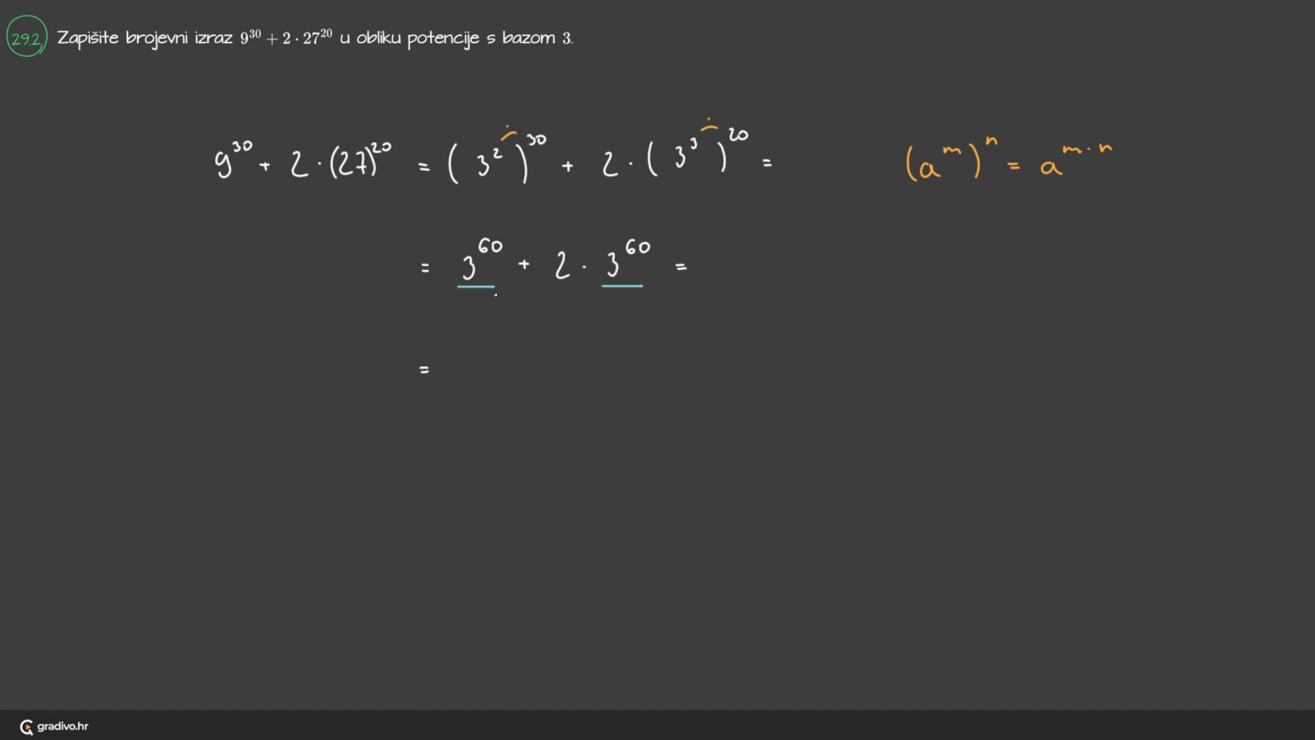 Zapišite brojevni izraz $9^{30}+2 \cdot 27^{20}$ u obliku potencije s bazom 3.