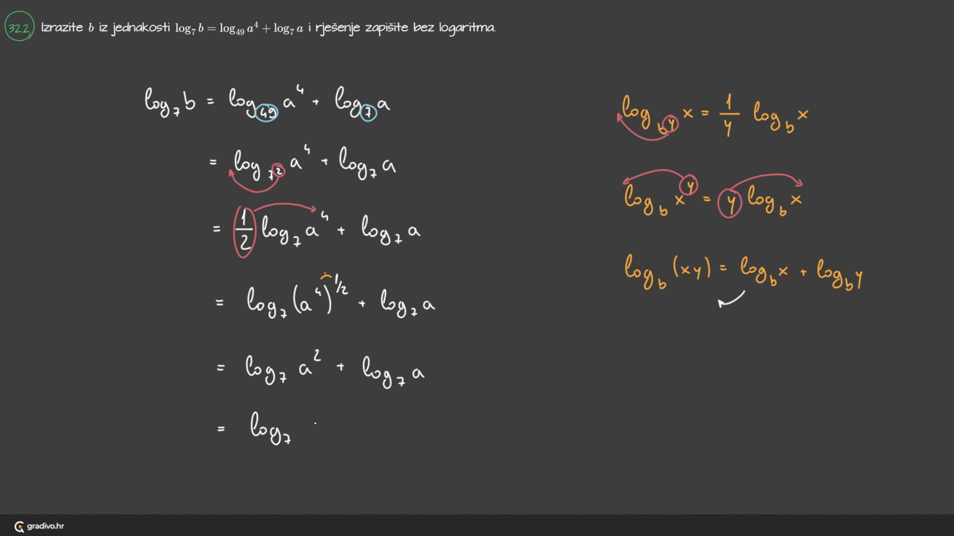 Izrazite $b$ iz jednakosti $\log _{7} b=\log _{49} a^{4}+\log _{7} a$ i rješenje zapišite bez logaritma.