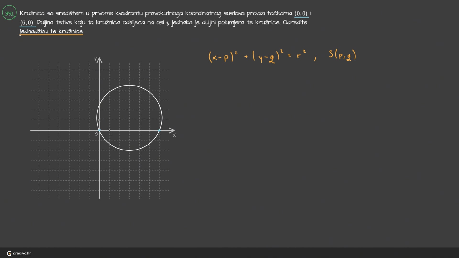 Krużnica sa središtem u prvome kvadrantu pravokutnoga koordinatnog sustava prolazi točkama $(0,0)$ i $(6,0)$. Duljina tetive koju ta krużnica odsijeca na osi $y$ jednaka je duljini polumjera te kruźnice. Odredite jednadžbu te kružnice.