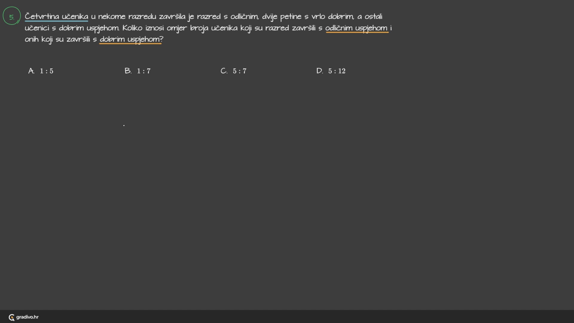 Četvrtina učenika u nekome razredu završila je razred s odličnim, dvije petine s vrlo dobrim, a ostali učenici s dobrim uspjehom. Koliko iznosi omjer broja učenika koji su razred završili s odličnim uspjehom i onih koji su završili s dobrim uspjehom?