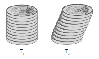 Na skici su prikazana dva geometrijska tijela ( $\mathrm{T}_{1}$ i $\mathrm{T}_{2}$ ) sastavljena od jednakoga broja identičnih novčića.