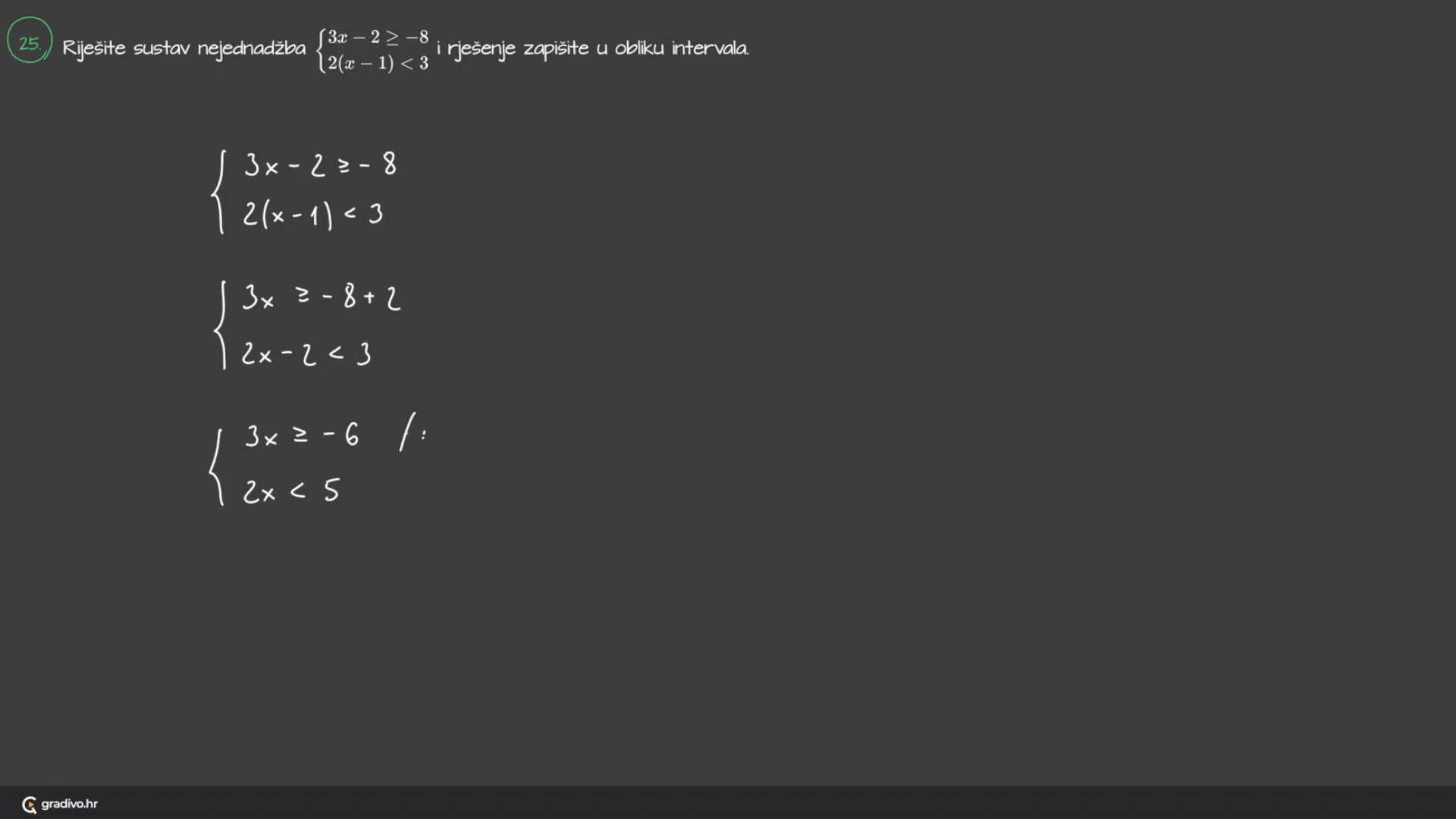 Riješite sustav nejednadžba $\left\{\begin{array}{l}3 x-2 \geq-8 \\ 2(x-1)<3\end{array}\right.$ i rješenje zapišite u obliku intervala.