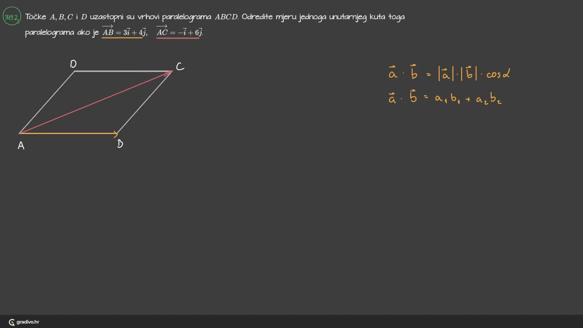 Točke $A, B, C$ i $D$ uzastopni su vrhovi paralelograma $A B C D$. Odredite mjeru jednoga unutarnjeg kuta toga paralelograma ako je $\overrightarrow{A B}=3 \vec{i}+4 \vec{j}, \overrightarrow{A C}=-\vec{i}+6 \vec{j}$.