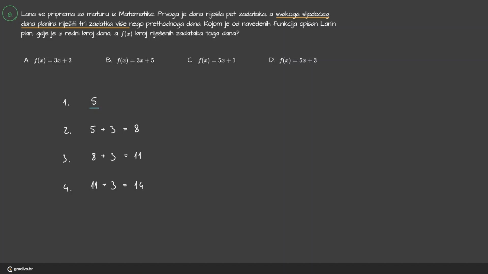 Lana se priprema za maturu iz Matematike. Prvoga je dana riješila pet zadataka, a svakoga sljedećeg dana planira riješiti tri zadatka više nego prethodnoga dana. Kojom je od navedenih funkcija opisan Lanin plan, gdje je $x$ redni broj dana, a $f(x)$ broj riješenih zadataka toga dana?