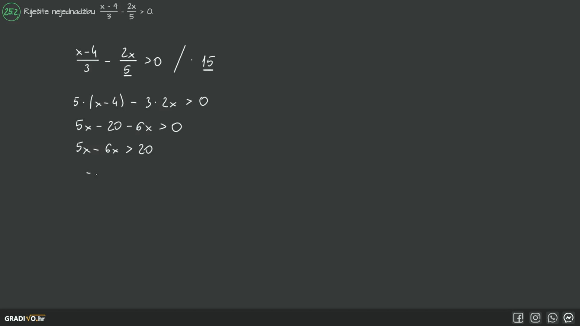Riješite nejednadžbu $\frac{x-4}{3}-\frac{2 x}{5}>0$.