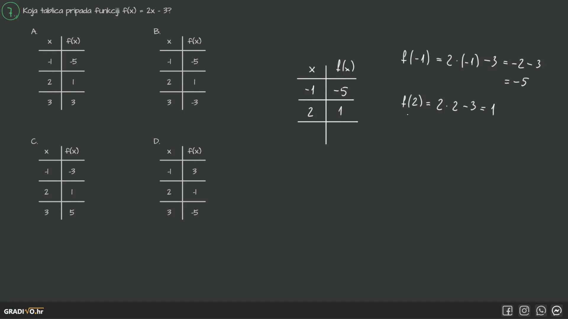 Koja tablica pripada funkciji $f(x)=2 x-3$ ?