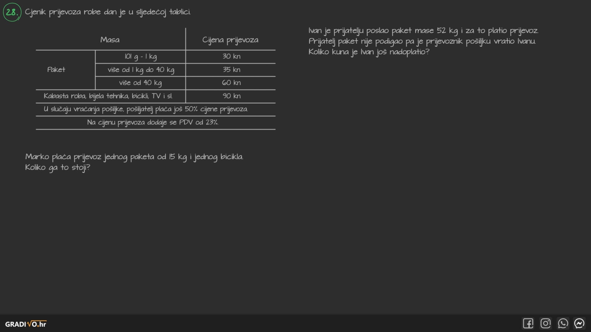 28.1. Marko plaća prijevoz jednog paketa od 15 kg i jednog bicikla. Koliko ga to stoji?