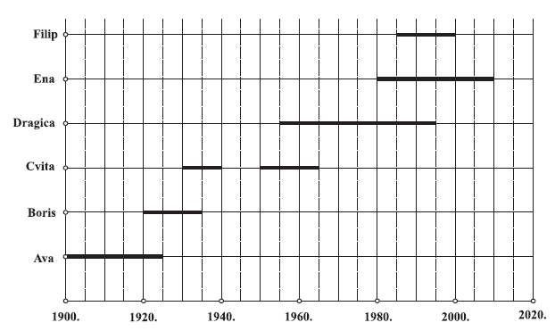 Na slici su grafički prikazana vremenska razdoblja u kojima su navedene osobe bile zaposlene.