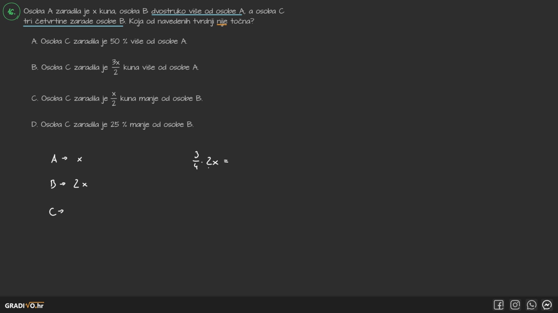 C. Osoba C zaradila je \(\frac{x}{2}\) kuna manje od osobe B.