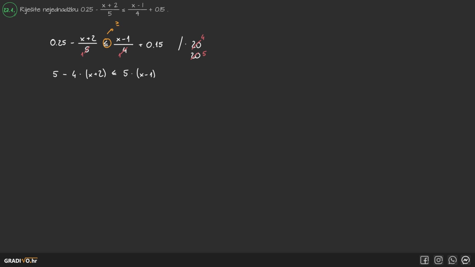 Riješite nejednadžbu \(0.25-\frac{x+2}{5} \leq \frac{x-1}{4}+0.15\).