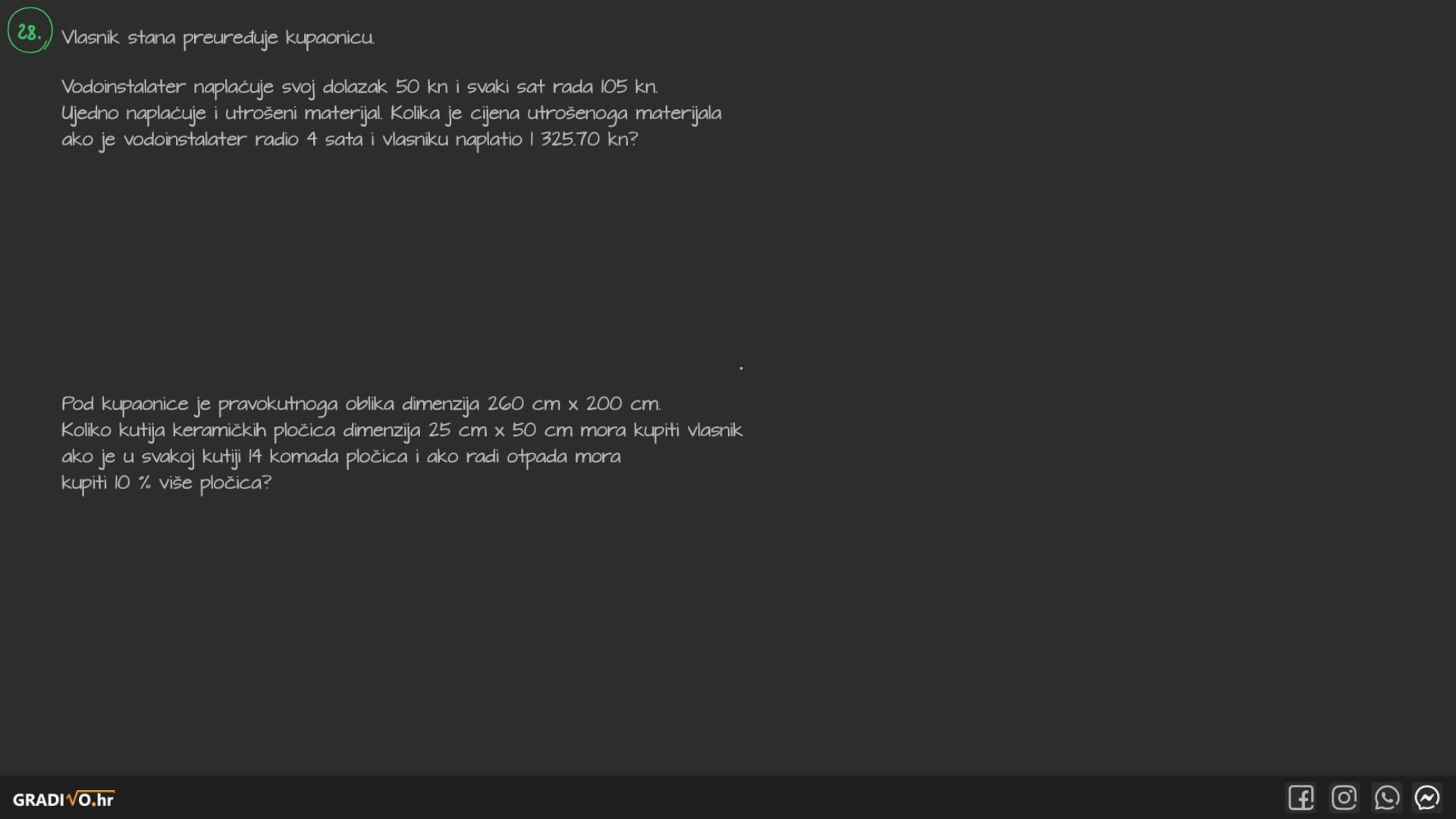 28.1. Vodoinstalater naplaćuje svoj dolazak 50 kn i svaki sat rada 105 kn. Ujedno naplaćuje i utrošeni materijal. Kolika je cijena utrošenoga materijala ako je vodoinstalater radio 4 sata i vlasniku naplatio 1325.70 kn? kn Ip