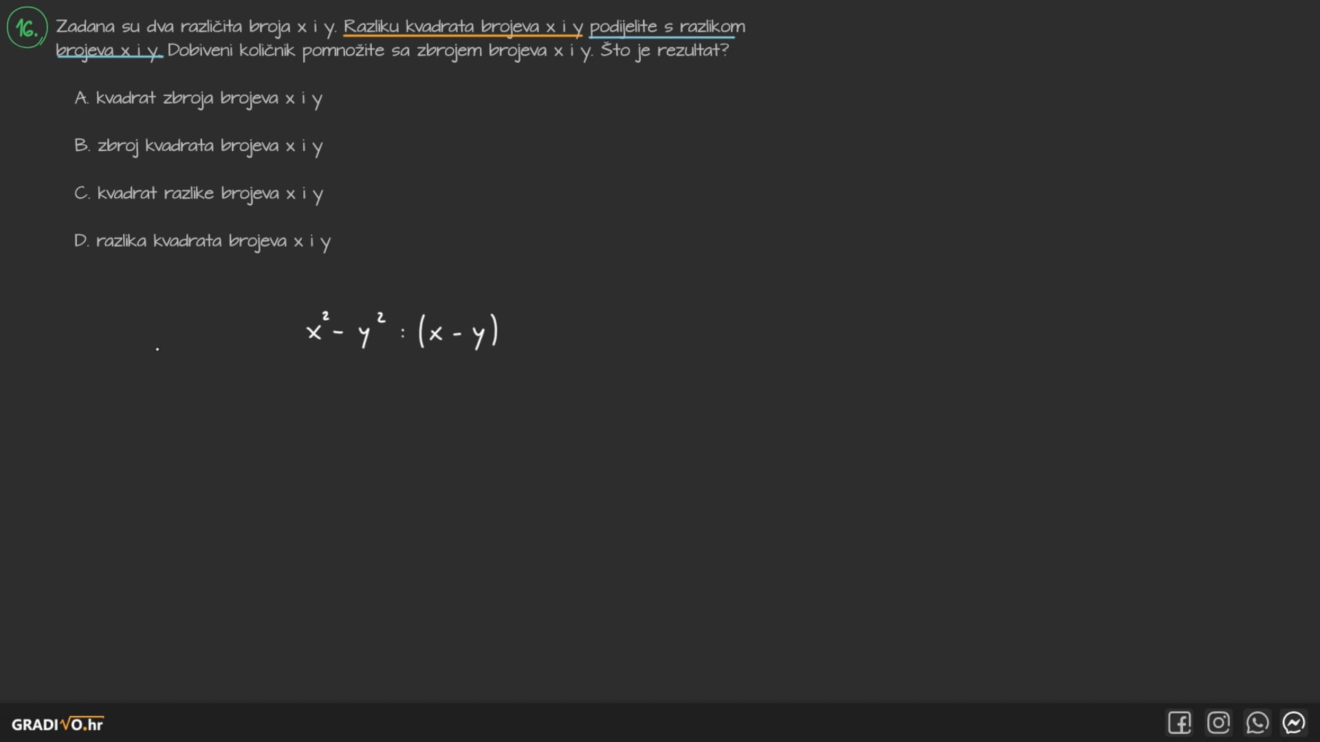 Zadana su dva različita broja $x$ i $y$. Razliku kvadrata brojeva $x$ i $y$ podijelite s razlikom brojeva $x$ i $y$. Dobiveni količnik pomnožite sa zbrojem brojeva $x$ i $y$. Što je rezultat?