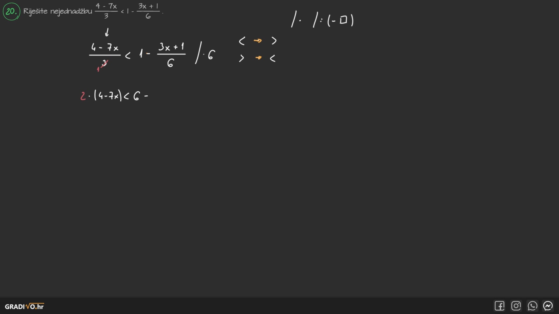 Riješite nejednadžbu $\frac{4-7 x}{3}<1-\frac{3 x+1}{6}$.