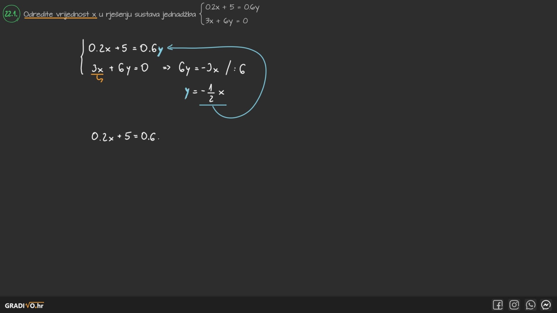 Odredite vrijednost $x$ u rješenju sustava jednadžba $\left\{\begin{array}{c}0.2 x+5=0.6 y \\ 3 x+6 y=0\end{array}\right.$.