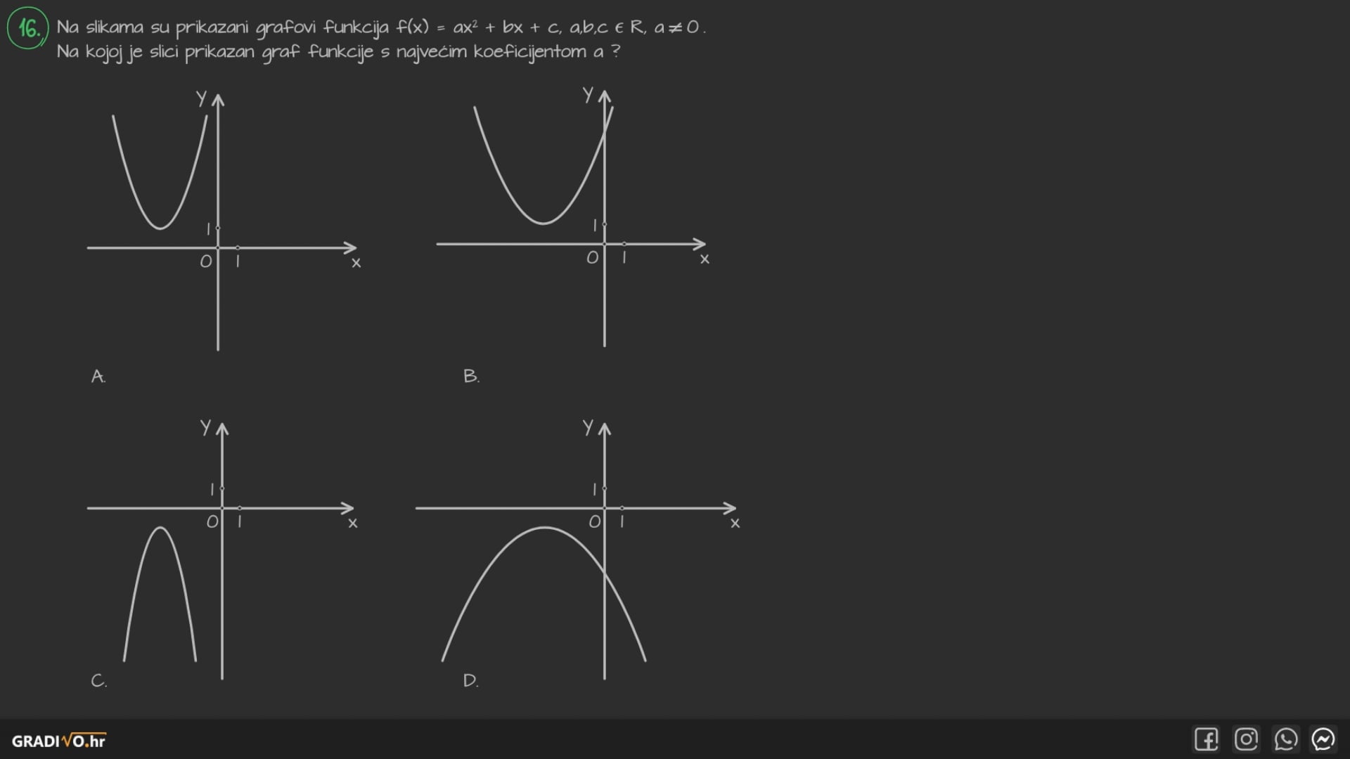 Na slikama su prikazani grafovi funkcija $f(x)=a x^{2}+b x+c, a, b, c \in \mathbf{R}, a \neq 0$.Na kojoj je slici prikazan graf funkcije s najvećim koeficijentom $a$ ?