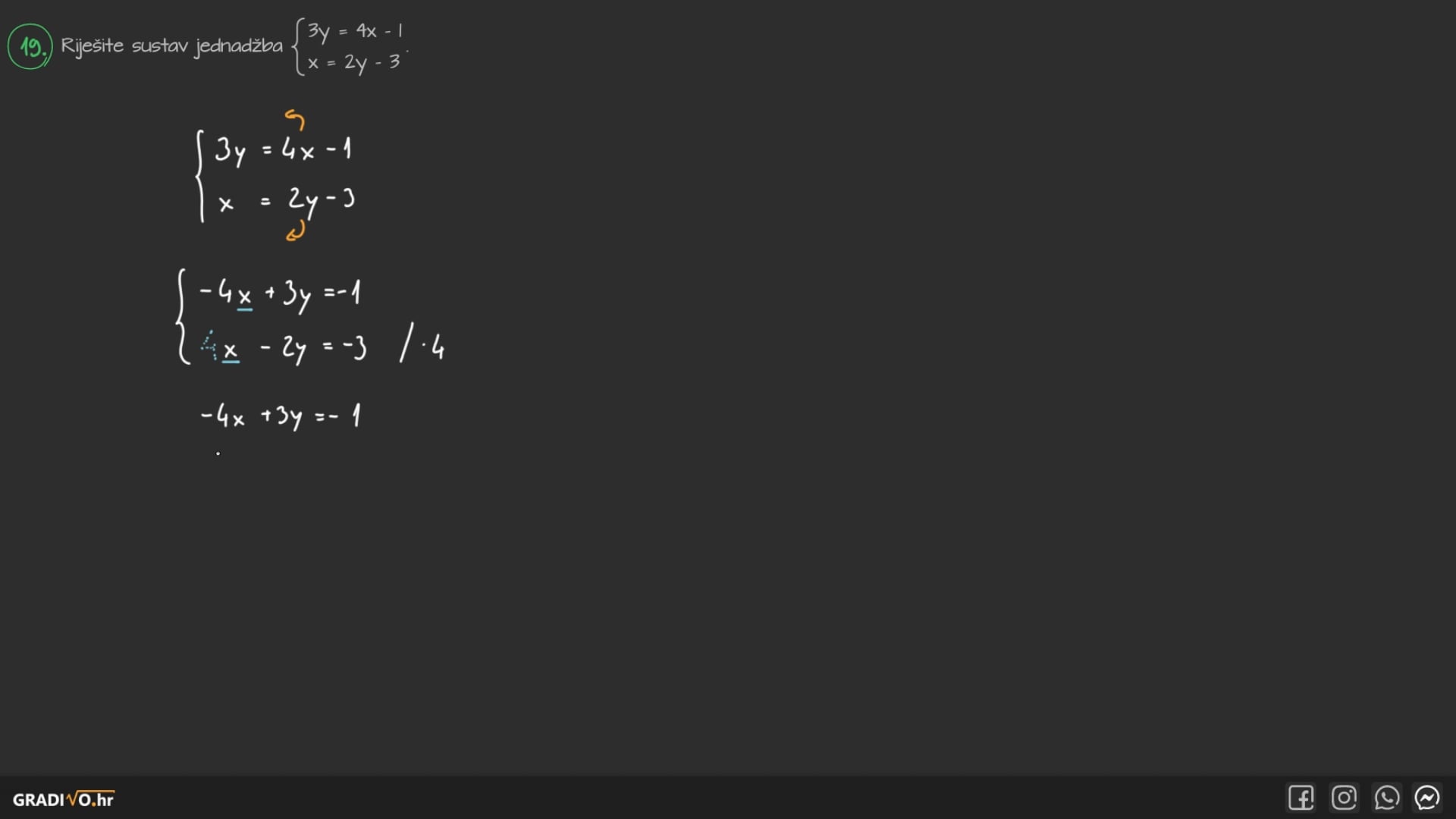Riješite sustav jednadžba $\left\{\begin{array}{l}3 y=4 x-1 \\ x=2 y-3\end{array}\right.$