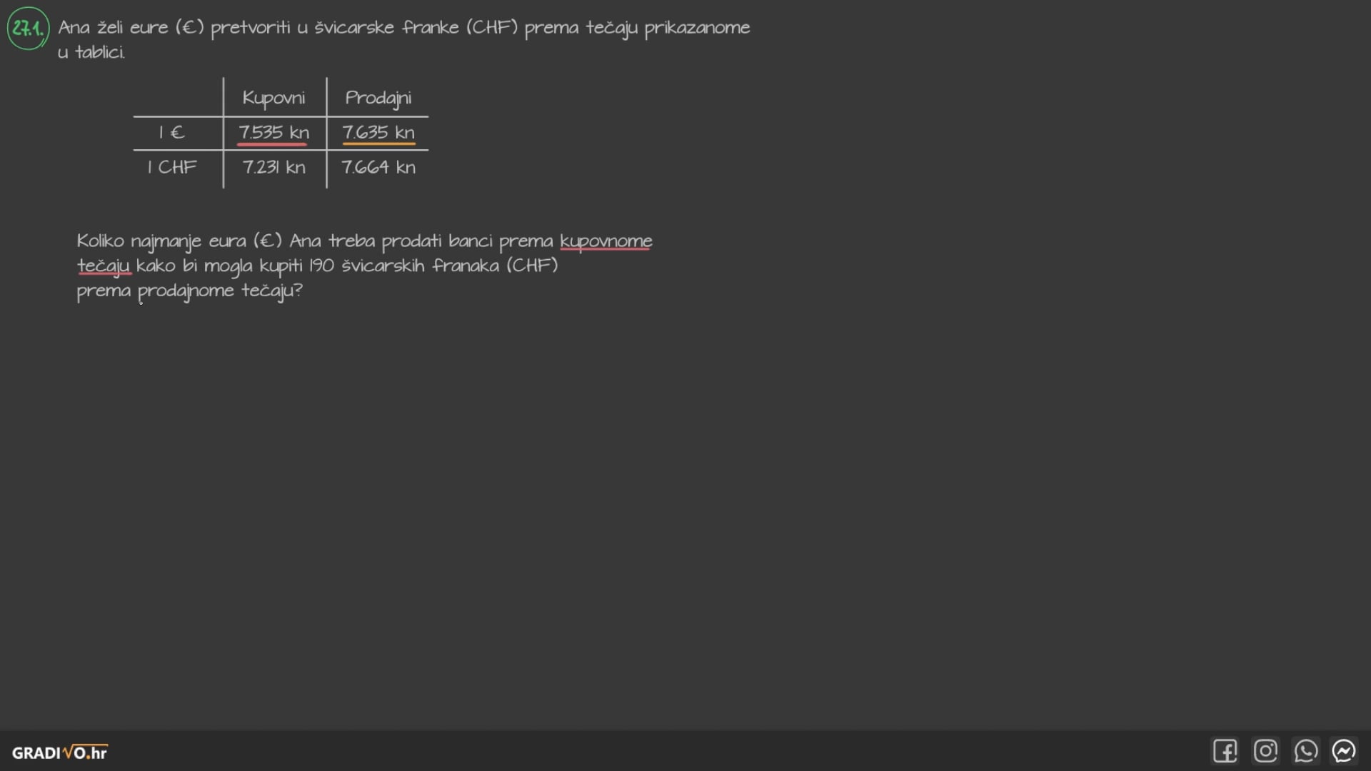 Koliko najmanje eura (€) Ana treba prodati banci prema kupovnome tečaju kako bi mogla kupiti 190 švicarskih franaka (CHF) prema prodajnome tečaju?