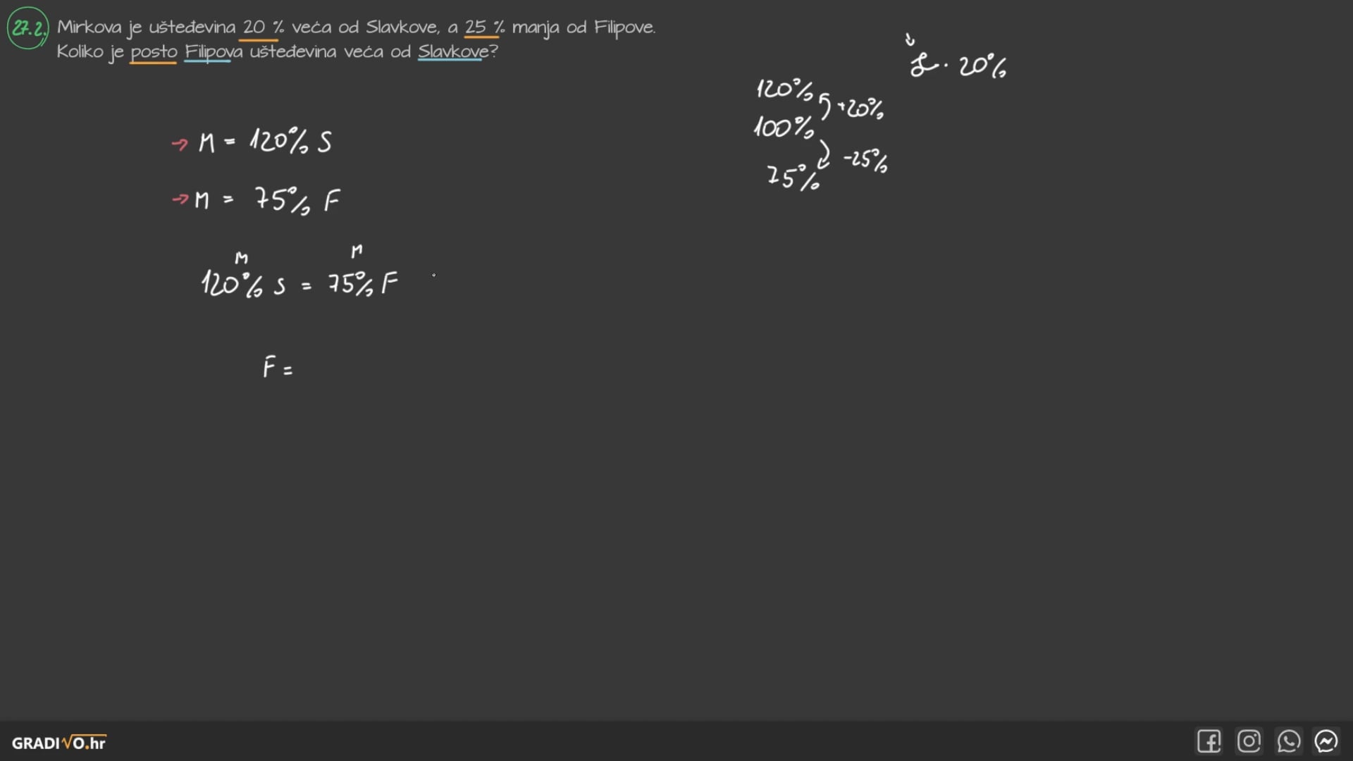 Mirkova je ušteđevina $20 \%$ veća od Slavkove, a $25 \%$ manja od Filipove. Koliko je posto Filipova ušteđevina veća od Slavkove?