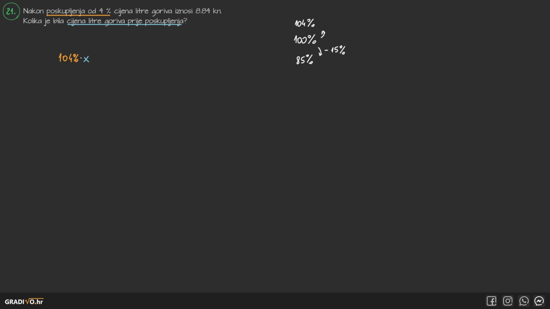 Nakon poskupljenja od \(4 \%\) cijena litre goriva iznosi 8.84 kn. Kolika je bila cijena litre goriva prije poskupljenja?