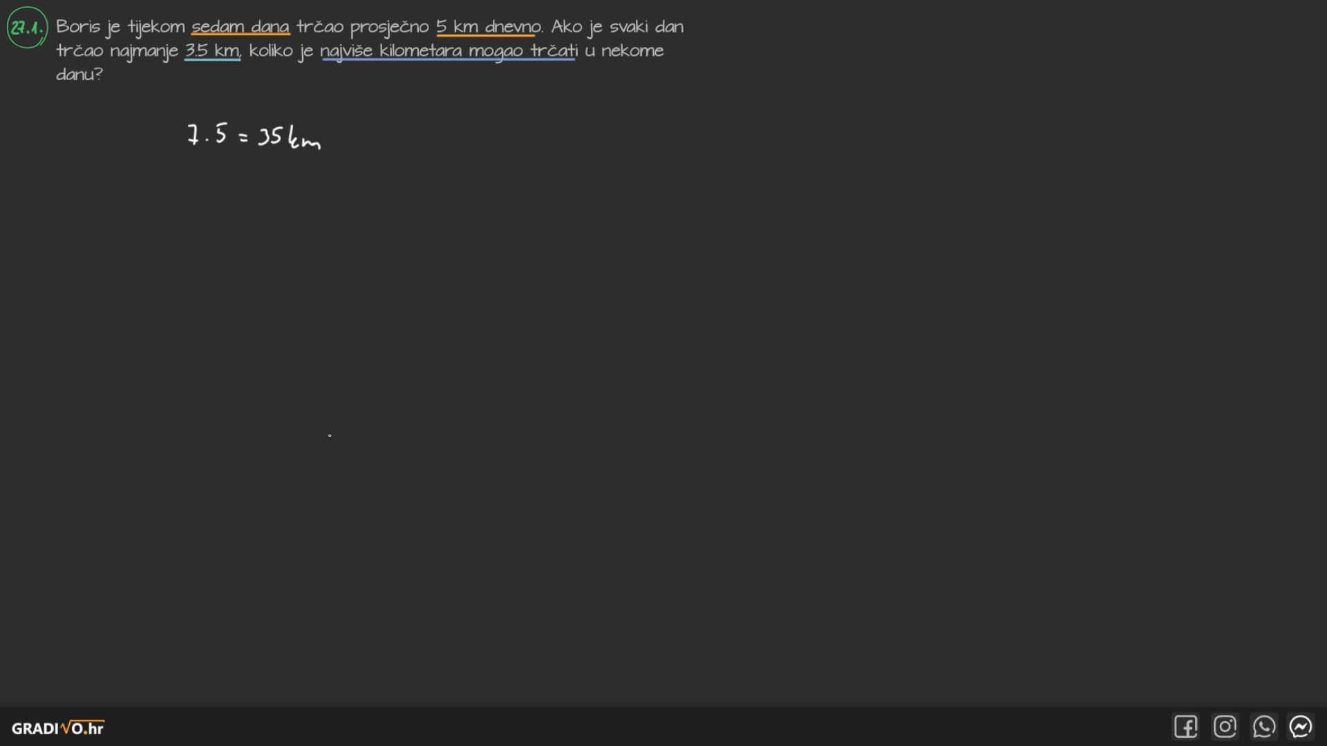 Boris je tijekom sedam dana trčao prosječno 5 km dnevno. Ako je svaki dan trčao najmanje 3.5 km, koliko je najviše kilometara mogao trčati u nekome danu?