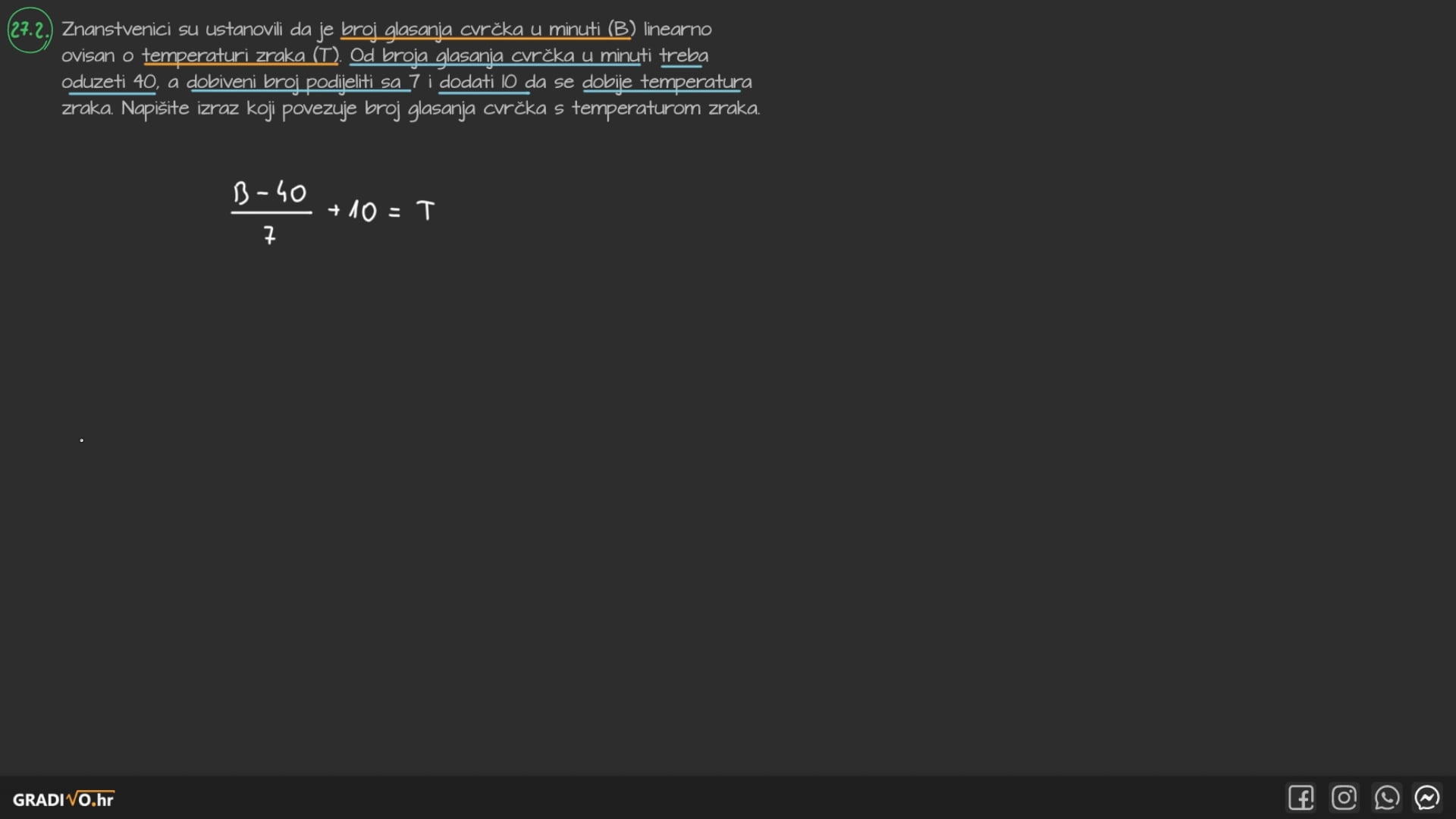 Znanstvenici su ustanovili da je broj glasanja cvrčka u minuti (B) linearno ovisan o temperaturi zraka (T). Od broja glasanja cvrčka u minuti treba oduzeti 40, a dobiveni broj podijeliti sa 7 i dodati 10 da se dobije temperatura zraka. Napišite izraz koji povezuje broj glasanja cvrčka s temperaturom zraka.