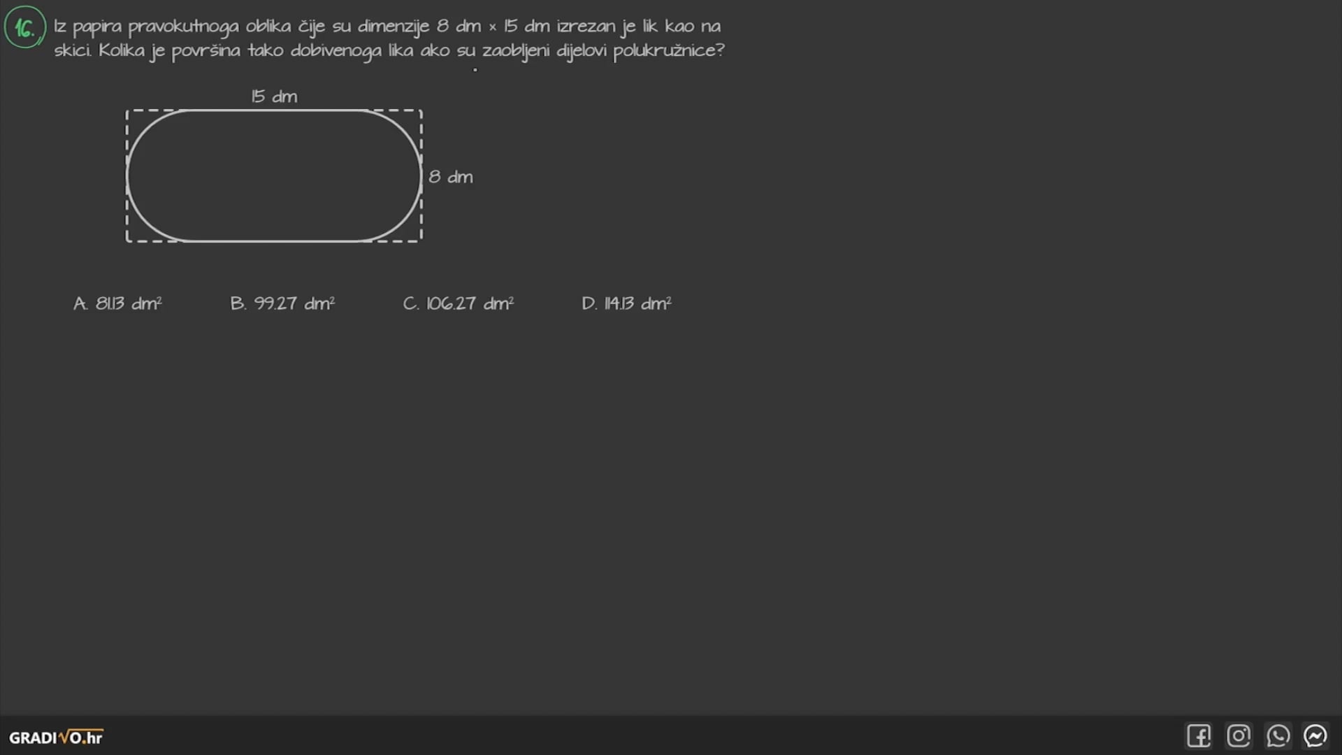 Iz papira pravokutnoga oblika čije su dimenzije $8 \mathrm{dm} \times 15 \mathrm{dm}$ izrezan je lik kao na skici. Kolika je površina tako dobivenoga lika ako su zaobljeni dijelovi polukružnice