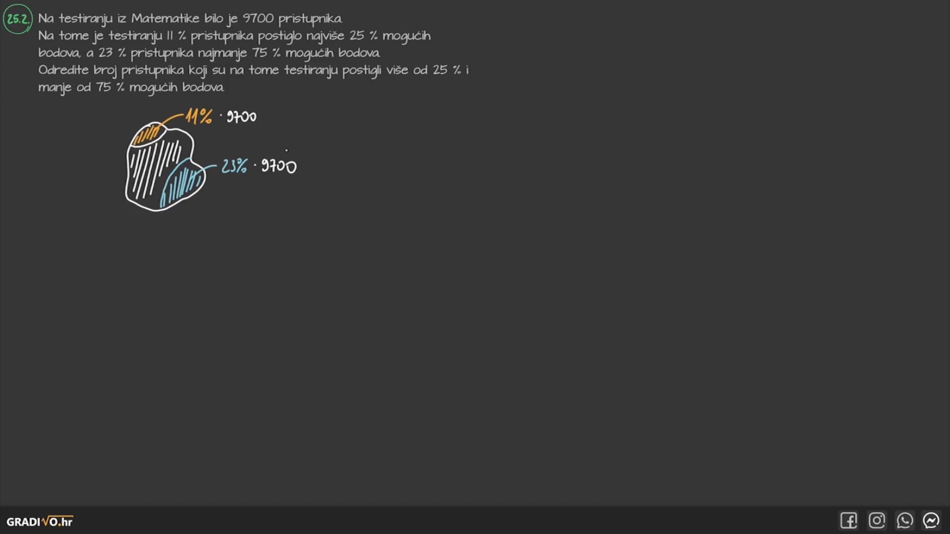 Na testiranju iz Matematike bilo je 9700 pristupnika. Na tome je testiranju $11 \%$ pristupnika postiglo najviše $25 \%$ mogućih bodova, a $23 \%$ pristupnika najmanje $75 \%$ mogućih bodova. Odredite broj pristupnika koji su na tome testiranju postigli više od $25 \%$ i manje od $75 \%$ mogućih bodova.