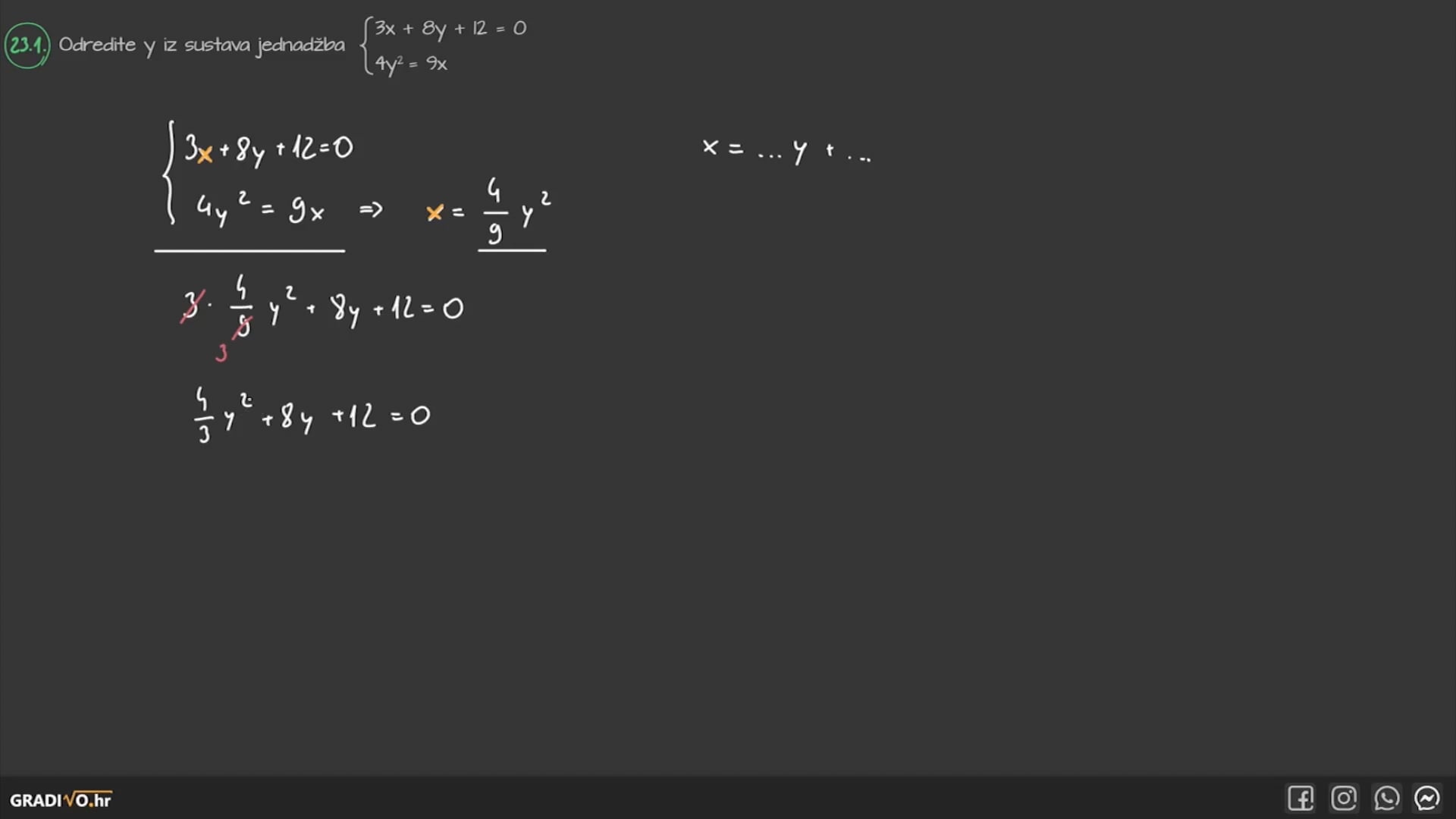 Odredite $y$ iz sustava jednadžba $\left\{\begin{array}{l}3 x+8 y+12=0 \\ 4 y^{2}=9 x\end{array}\right.$.
