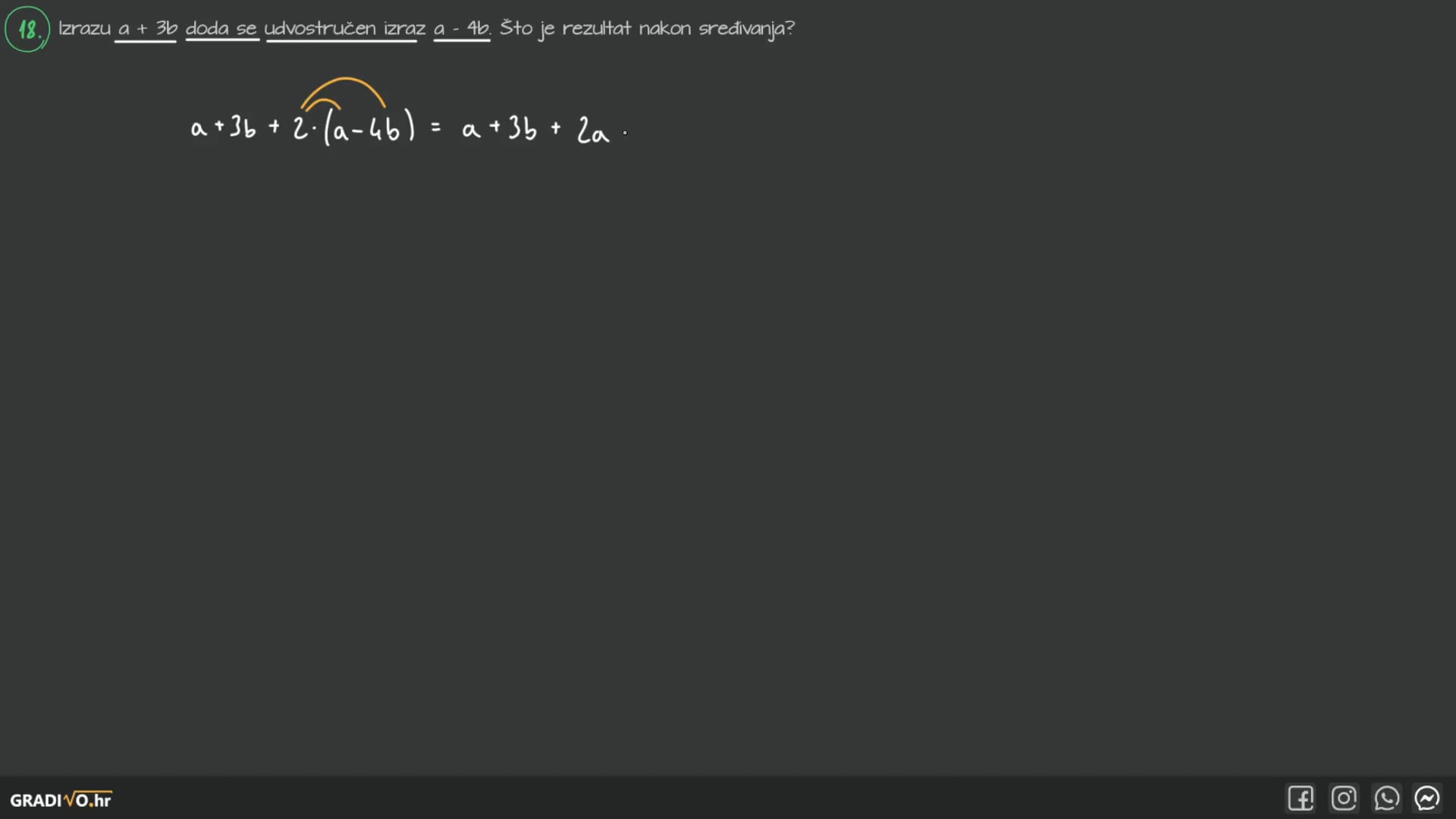 Izrazu $a+3 b$ doda se udvostručen izraz $a-4 b$. Što je rezultat nakon sređivanja?