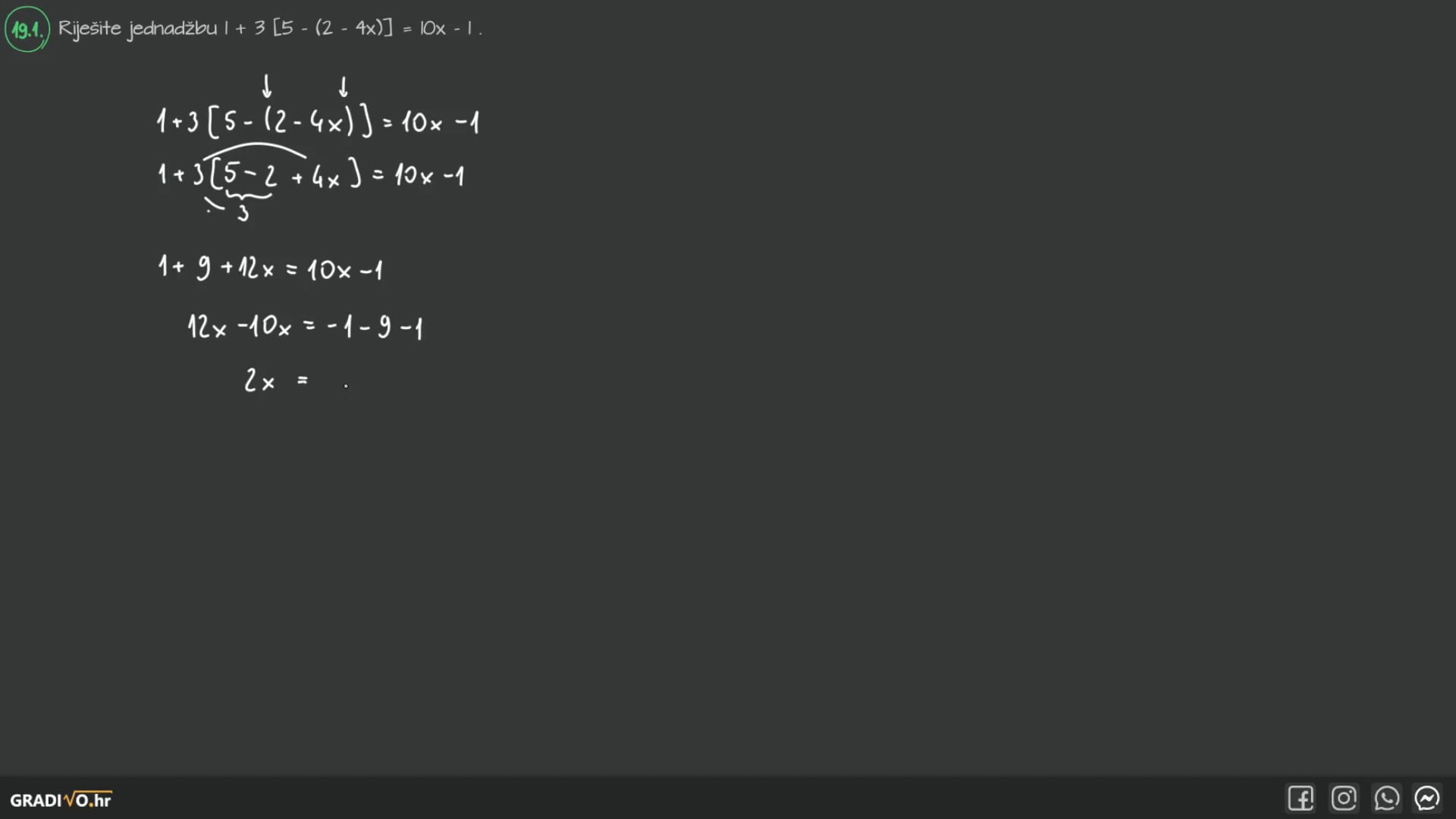 Riješite jednadžbu $1+3[5-(2-4 x)]=10 x-1$.
