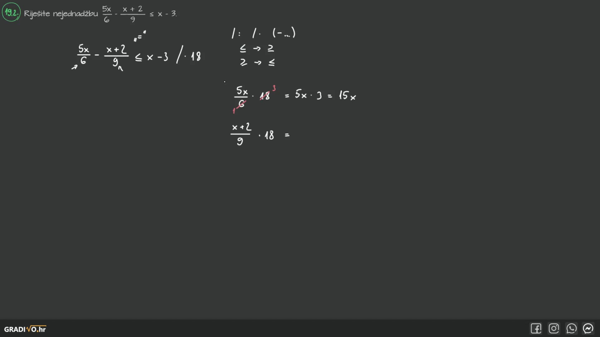 Riješite nejednadžbu $\frac{5 x}{6}-\frac{x+2}{9} \leq x-3$.