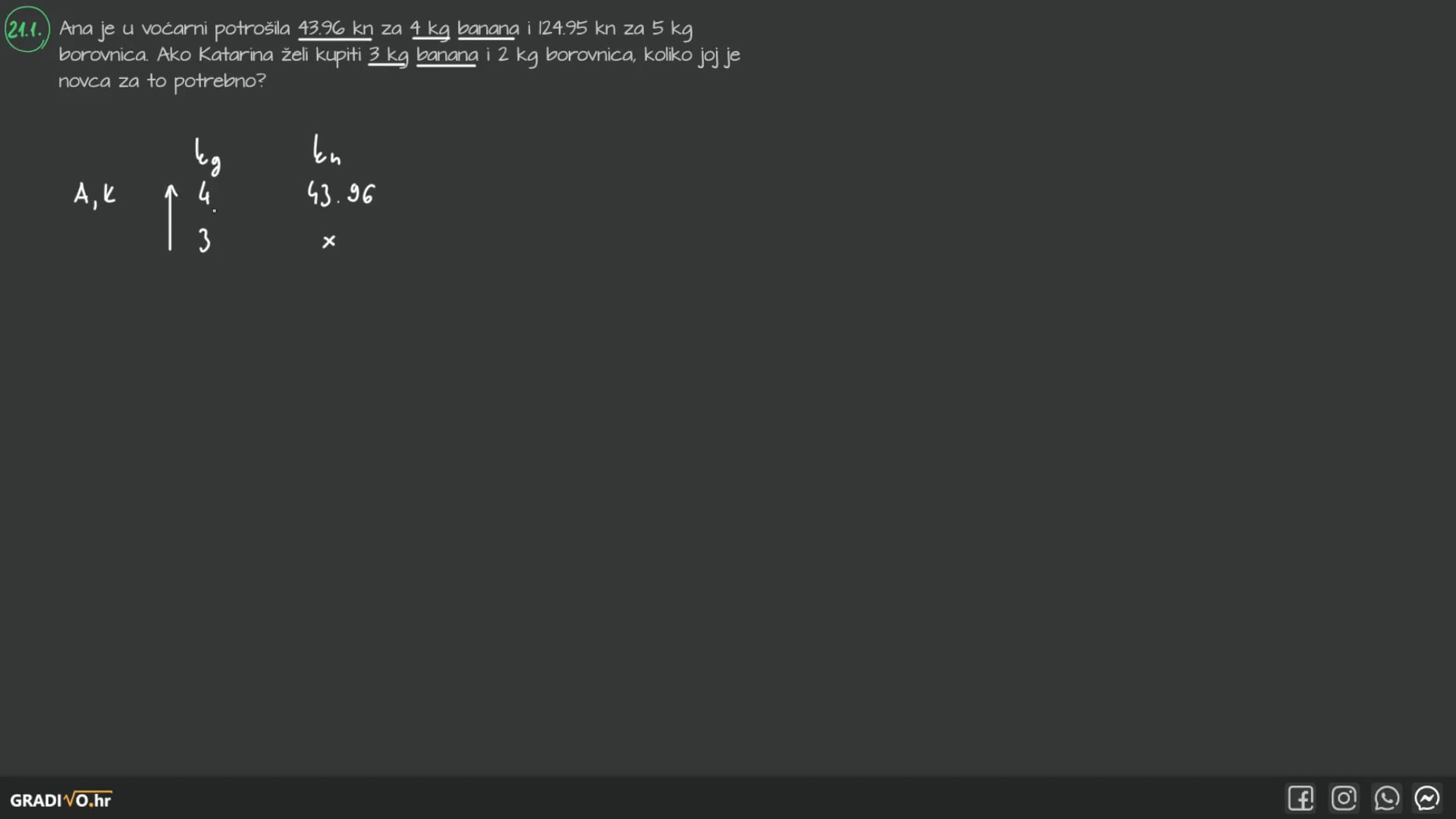Ana je u voćarni potrošila 43.96 kn za 4 kg banana i 124.95 kn za 5 kg borovnica. Ako Katarina želi kupiti 3 kg banana i 2 kg borovnica, koliko joj je novea za to potrebno?