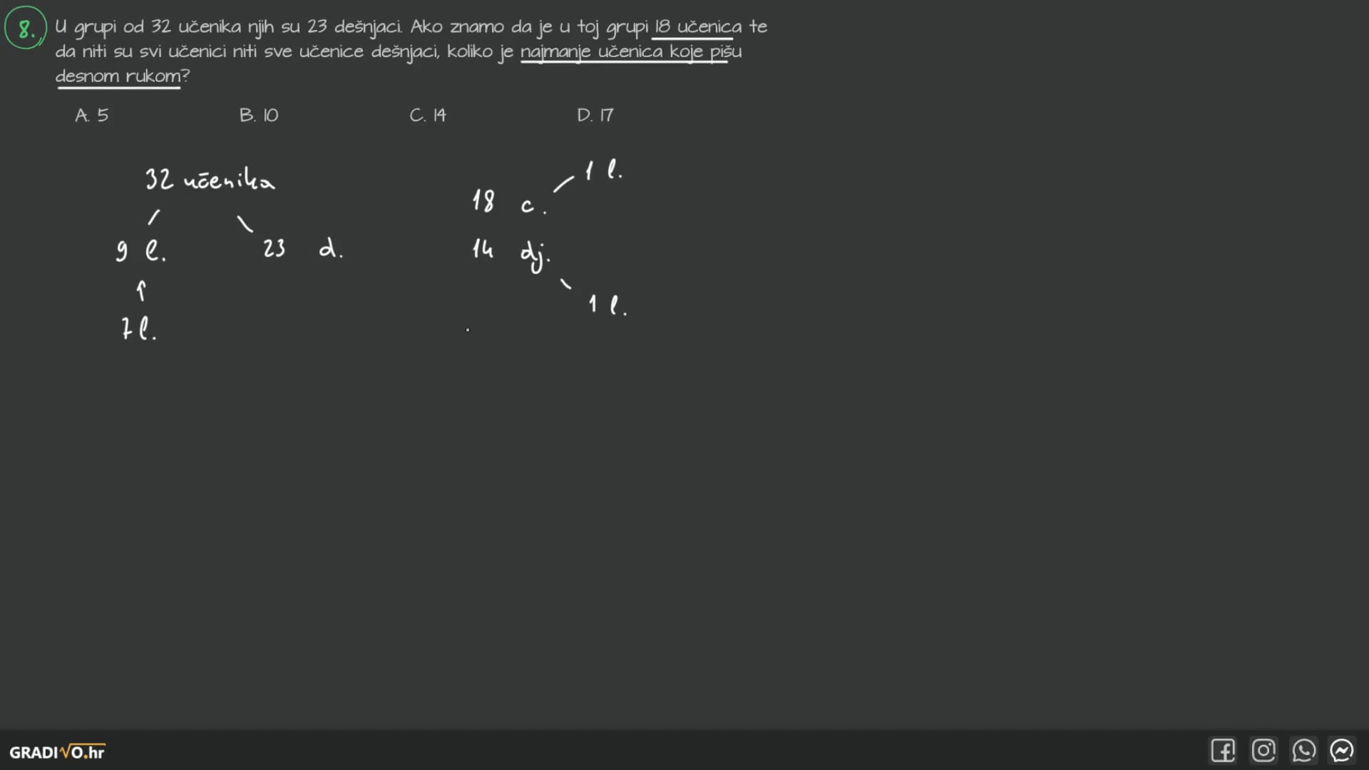 U grupi od 32 učenika njih su 23 dešnjaci. Ako znamo da je u toj grupi 18 učenica te da niti su svi učenici niti sve učenice dešnjaci, koliko je najmanje učenica koje pišudesnom rukom?