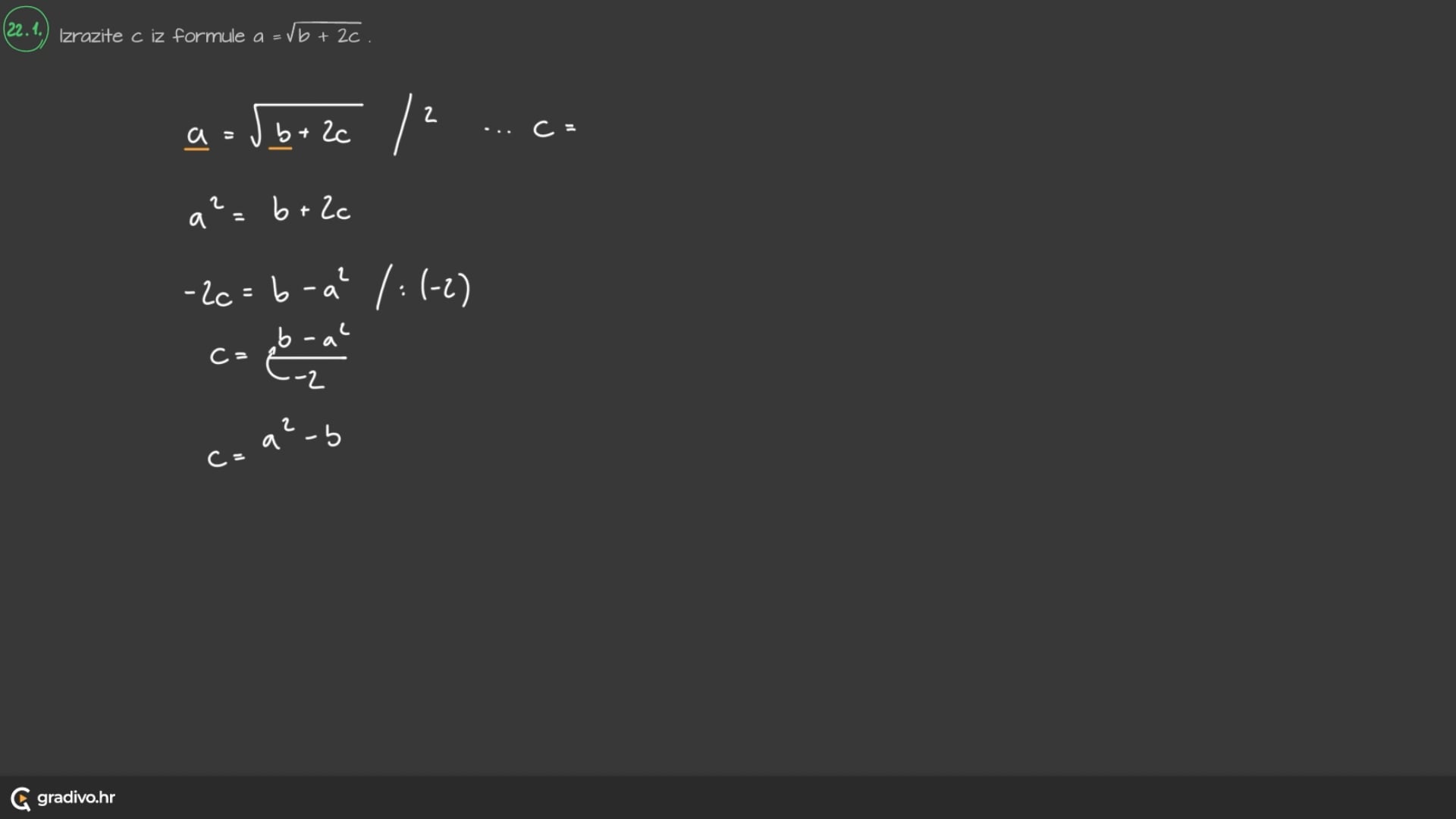 |zrazite $c$ iz formule $a=\sqrt{b+2 c}$.