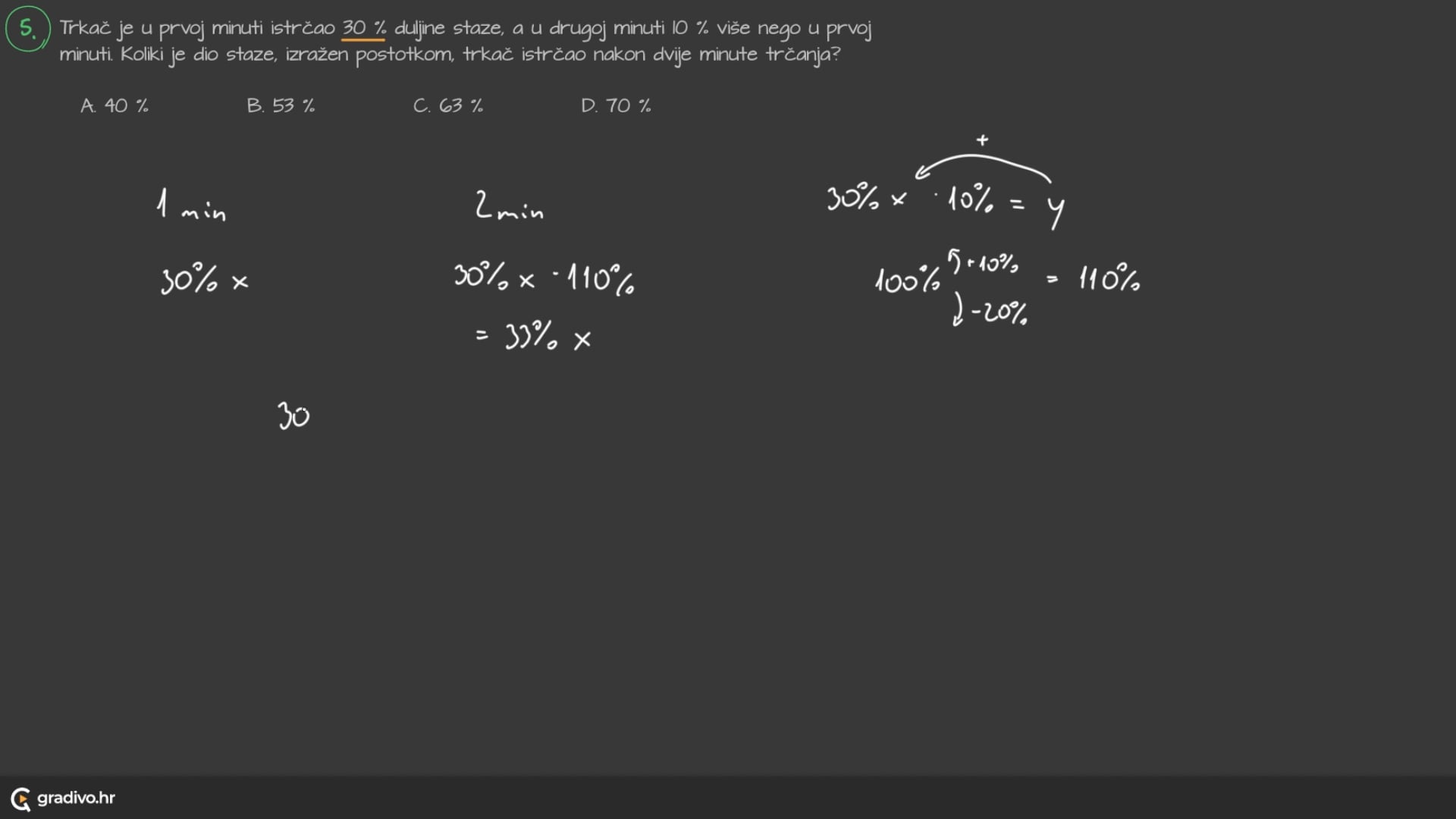Trkač je u prvoj minuti istrčao $30 \%$ duljine staze, a u drugoj minuti $10 \%$ više nego u prvoj minuti. Koliki je dio staze, izražen postotkom, trkač istrčao nakon dvije minute trčanja?