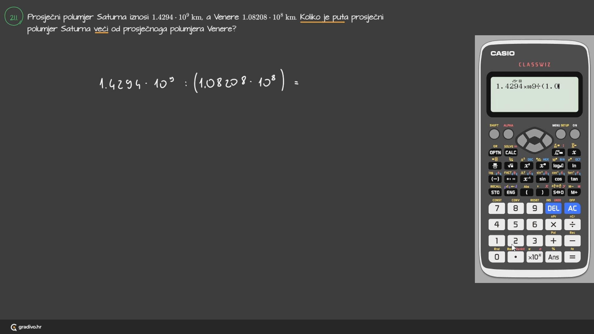 Prosječni polumjer Saturna iznosi $1.4294 \cdot 10^{9} \mathrm{~km}$, a Venere $1.08208 \cdot 10^{8} \mathrm{~km}$. Koliko je puta prosječni polumjer Saturna veći od prosječnoga polumjera Venere?
