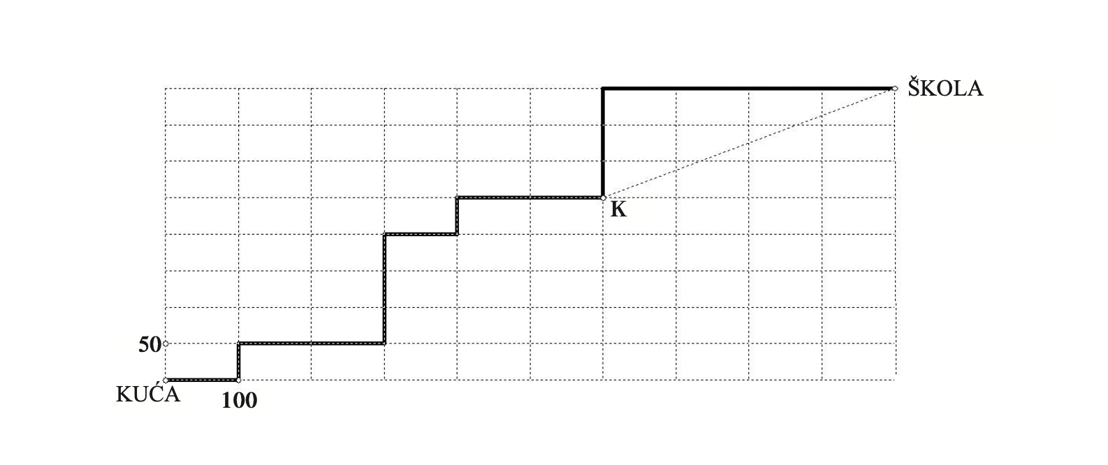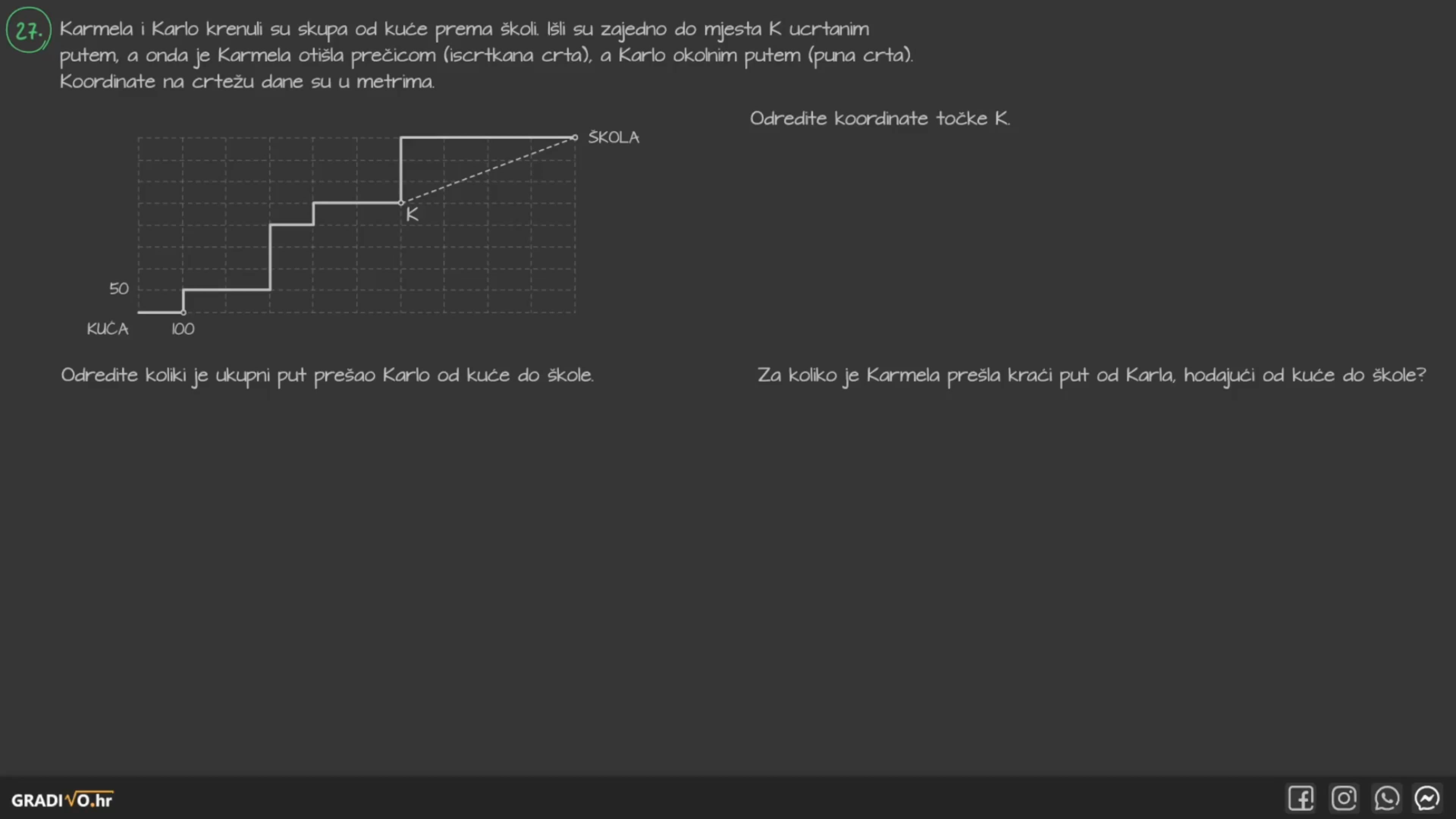 Karmela i Karlo krenuli su skupa od kuće prema školi. Išli su zajedno do mjesta $K$ ucrtanim putem, a onda je Karmela otišla prečicom (iscrtkana crta), a Karlo okolnim putem (puna crta). Koordinate na crtežu dane su u metrima.