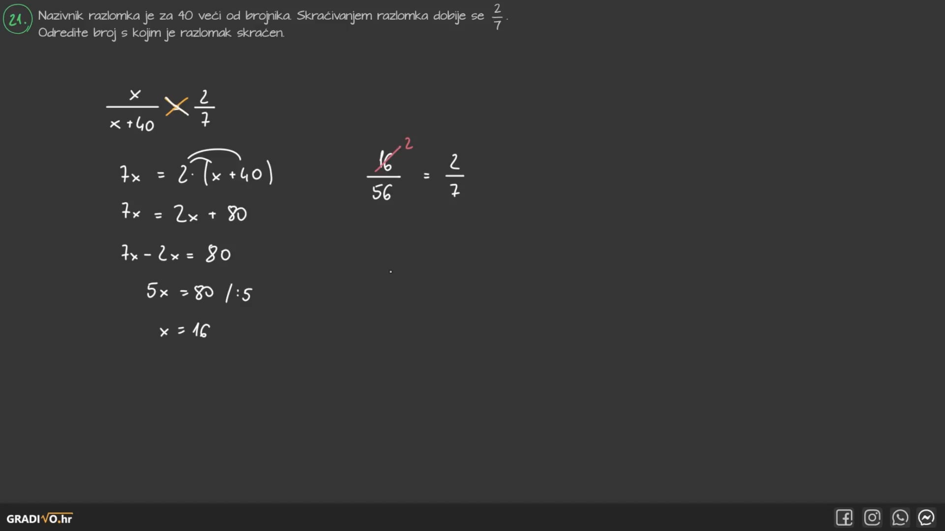 Nazivnik razlomka je za 40 veći od brojnika. Skraćivanjem razlomka dobije se \(\frac{2}{7}\). Odredite broj s kojim je razlomak skraćen.n