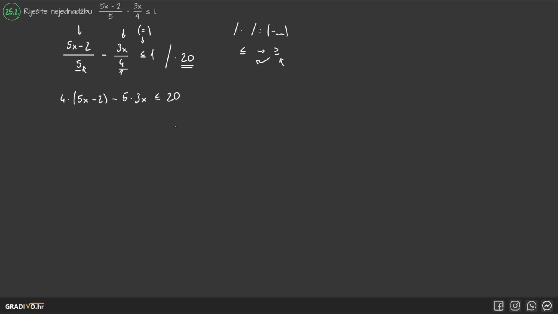 Riješite nejednadžbu \(\frac{5 x-2}{5}-\frac{3 x}{4} \leq 1\).